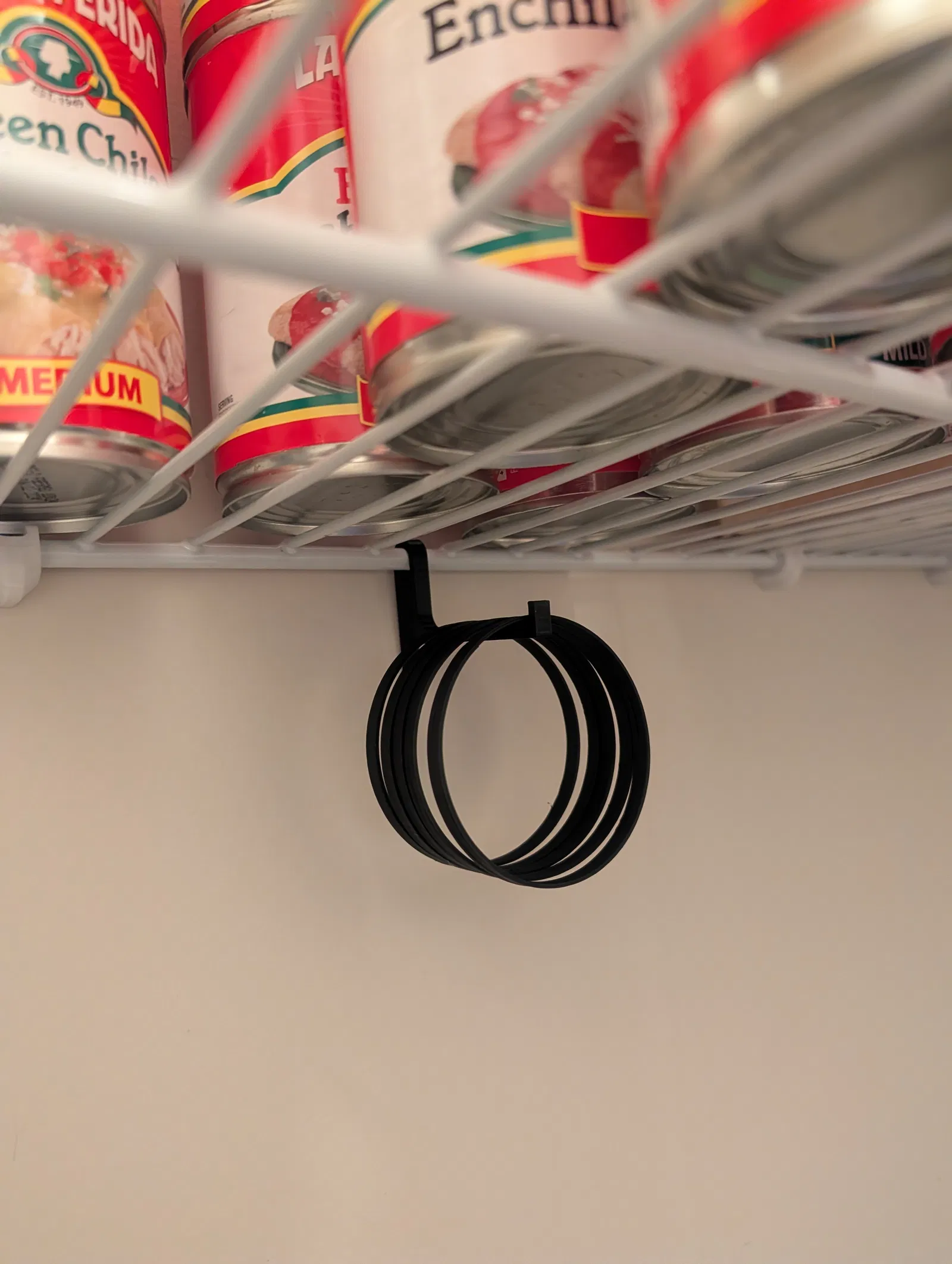 Một cái hook rất đơn giản để treo các vòng can-stacking. Nó móc lên sợi wire phía sau của kệ, sát tường, và có thể treo khoảng 8–10 vòng khi không dùng.