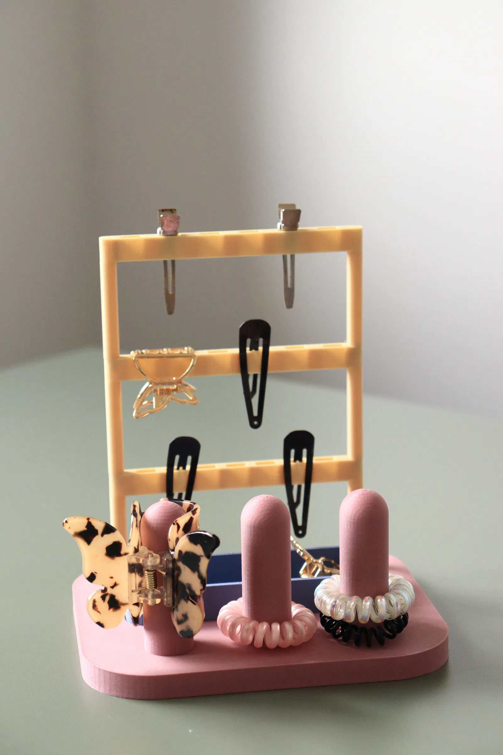 Kệ/giá modular để sắp xếp kẹp tóc và scrunchie gọn gàng: đế có 3 trụ treo dây buộc, khay nhỏ tích hợp và hệ rack stackable cho kẹp/ghim. Có 2 bản rack 6 khe và 7 khe, khuyến nghị supports cho rack.