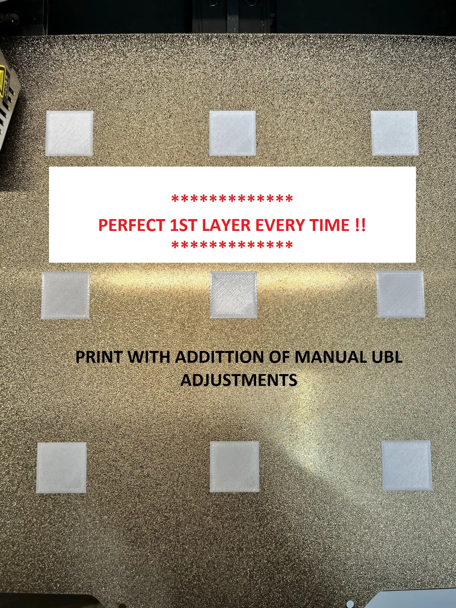 Nhiều người gặp khó ở first layer, và có vẻ Ender 3 S1 với CR Touch càng hay dính. Bạn làm đúng hết nhưng first layer vẫn không đều trên toàn bộ bed. Một cách xử lý là dùng tính năng UBL của Marlin: chạy auto bed leveling như bình thường, rồi chỉnh tay từng điểm trên mesh để nâng/hạ cho tới khi in ra đẹp. Vấn đề là các calibration squares hay không trùng vị trí với các điểm probe, nên rất khó chỉnh—in lại—xem kết quả—chỉnh tiếp cho tới khi đạt. File STL này được set up để mô phỏng đúng các điểm probe của mesh 3x3 ở giữa bàn, giả sử mọi thứ đang để default.