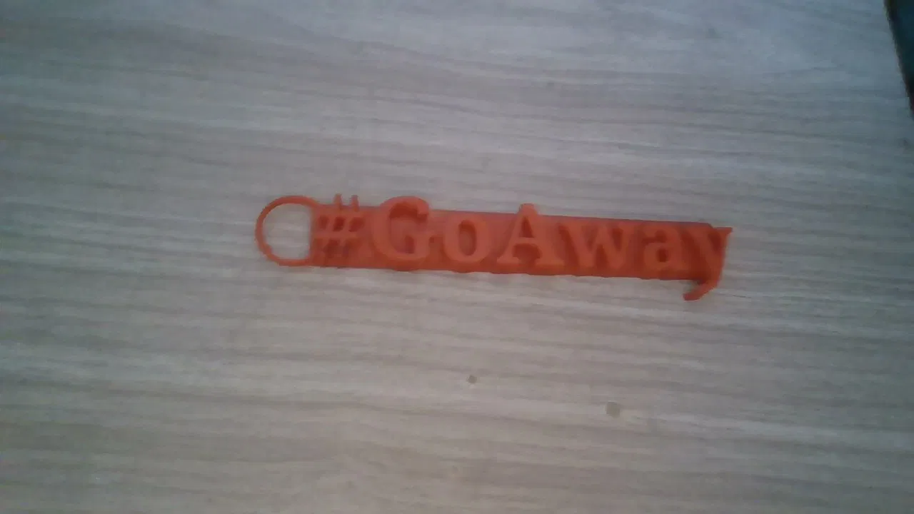 Mẫu móc khóa “Go Away” đơn giản, nhìn gọn gàng và dễ in. Tác giả nhấn mạnh đây là thiết kế mang tính vui vẻ, vô hại, không dùng để bắt nạt hay công kích người khác. In xong gắn làm keychain cho vui.
