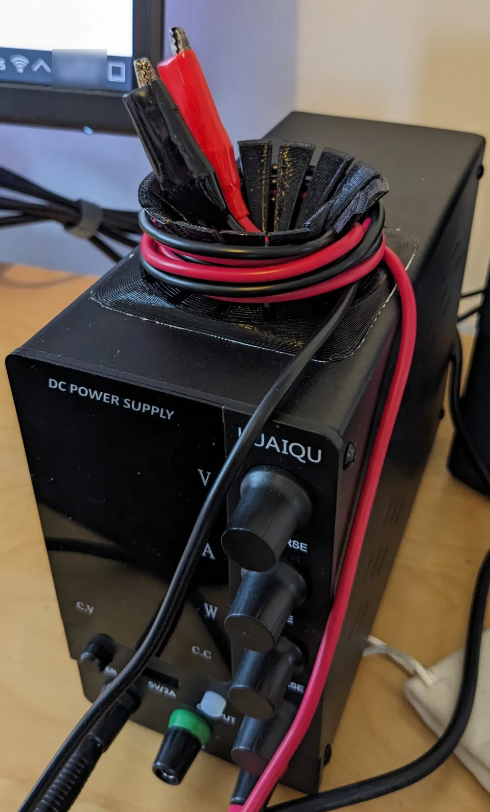 Cuộn quấn dây bằng TPU giúp gom gọn dây cho lab power supply, tránh dây nằm lung tung và giữ chắc trên cuộn. Kéo dây lên là TPU dẻo tự nhả để lấy dây dùng nhanh; có thể dán cố định bằng băng keo hai mặt.
