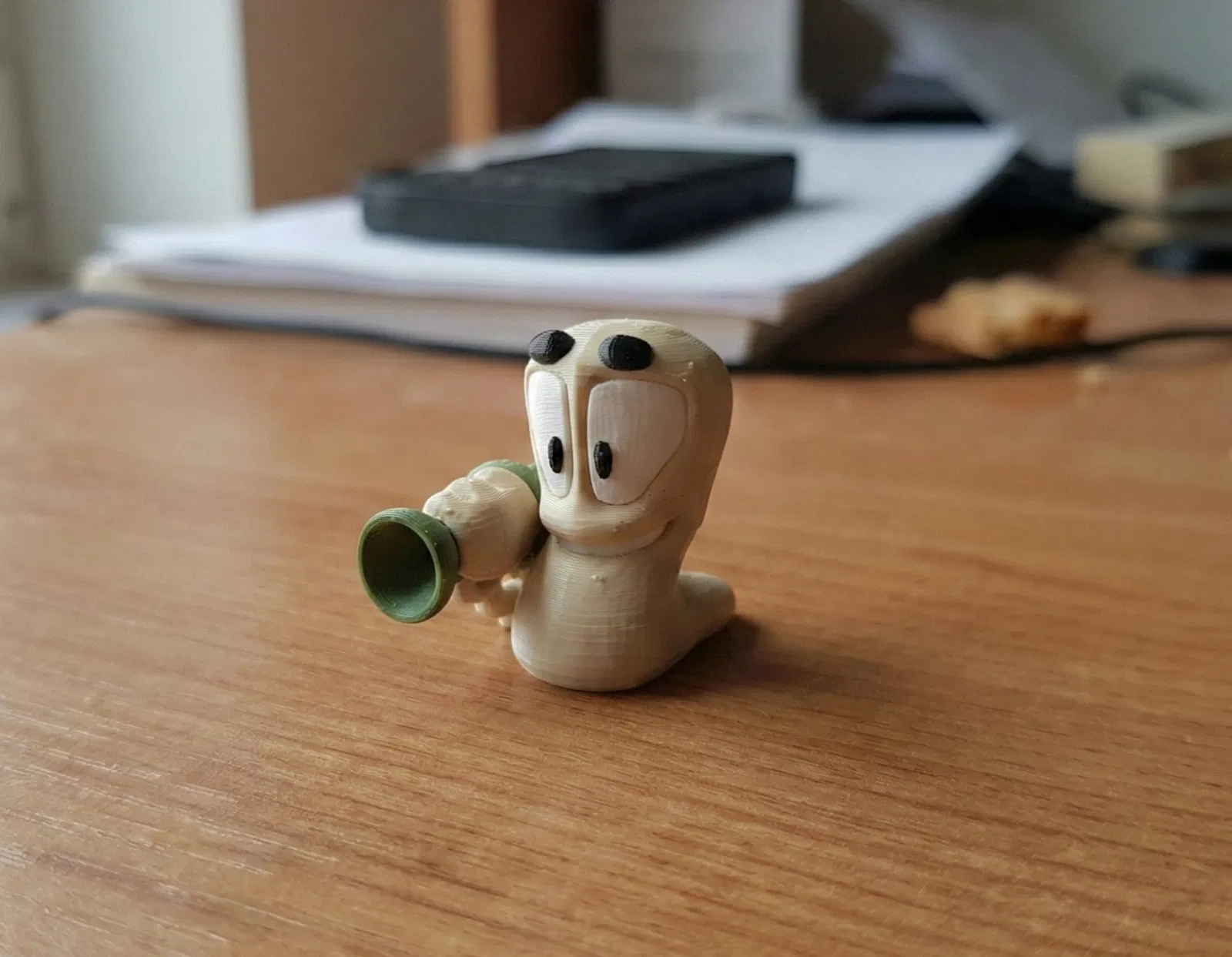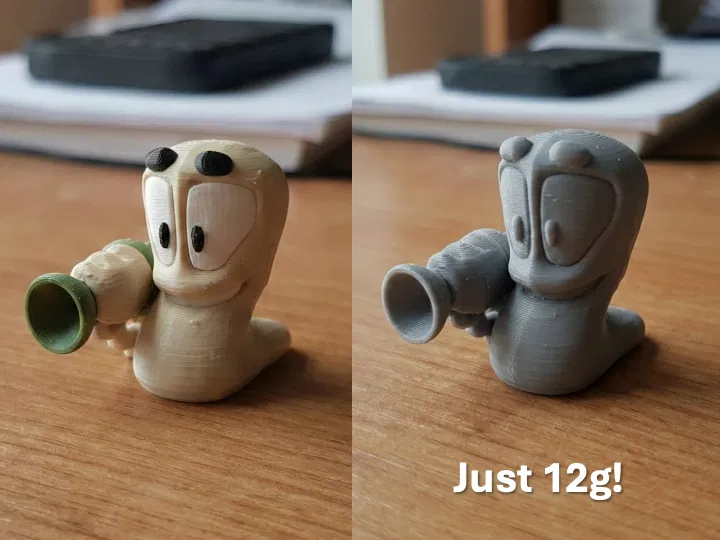 Làm nóng góc bàn với mô hình chú Worm trong Worms Armageddon cầm Bazooka! In monocolor khoảng 1:16h, chỉ tốn 12g filament. Nhớ dùng đúng setting trong file 3mf, cần Tree Supports, layer height 0.12mm.