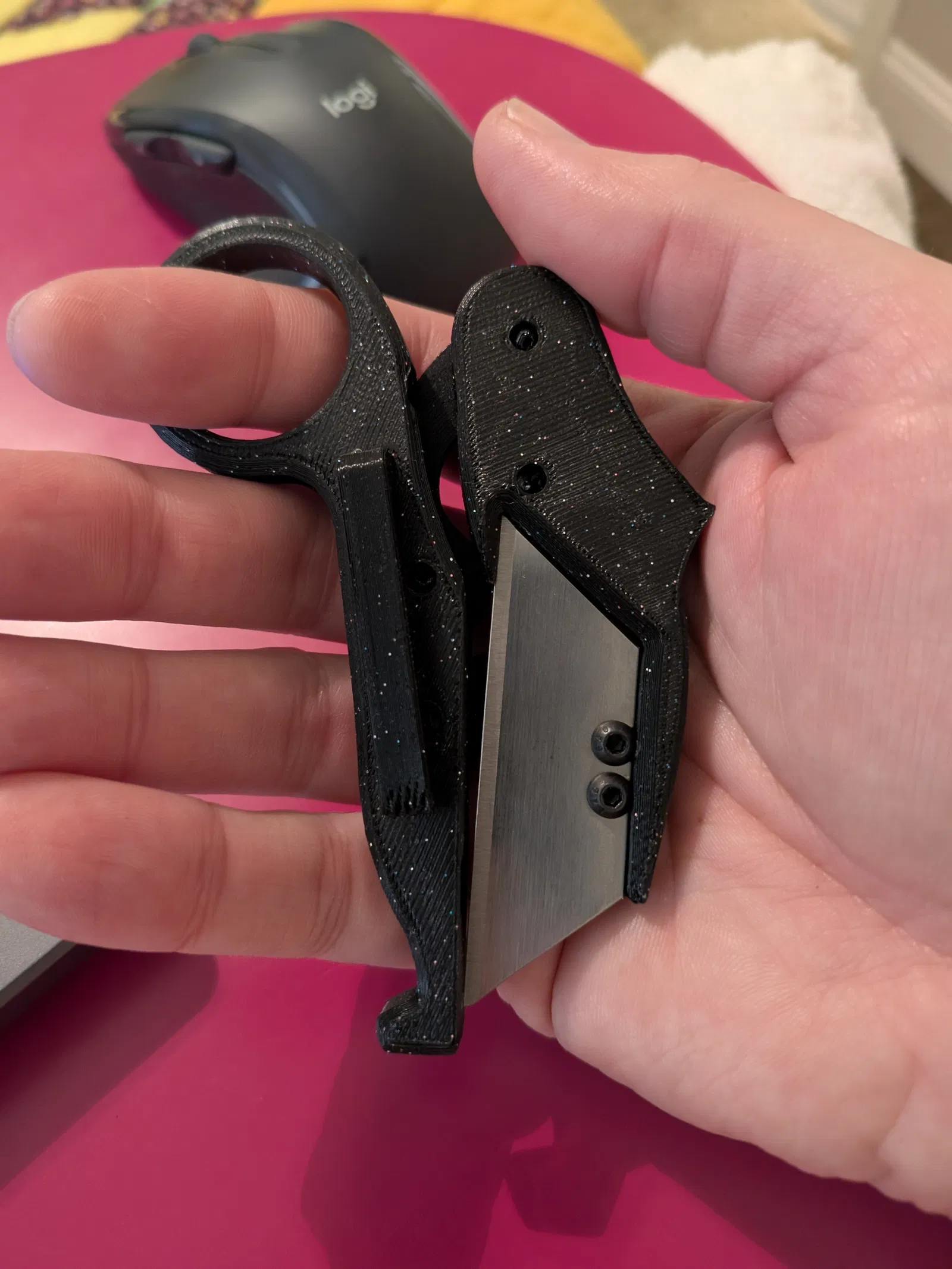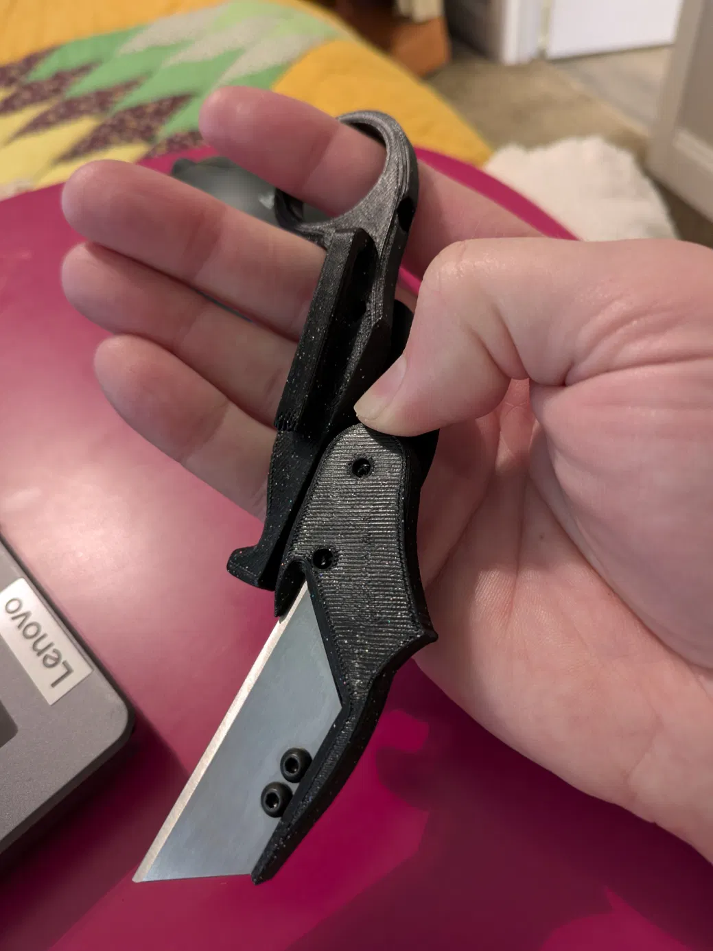 Remix cho Riptide utility knife với kẹp túi (pocket clip) để mở dao một tay theo hướng lưỡi chúc xuống như CRKT Provoke. Hướng dẫn in clip nằm nghiêng theo chiều dài và dán superglue vào grip, đổi hướng bằng mirror trong slicer.