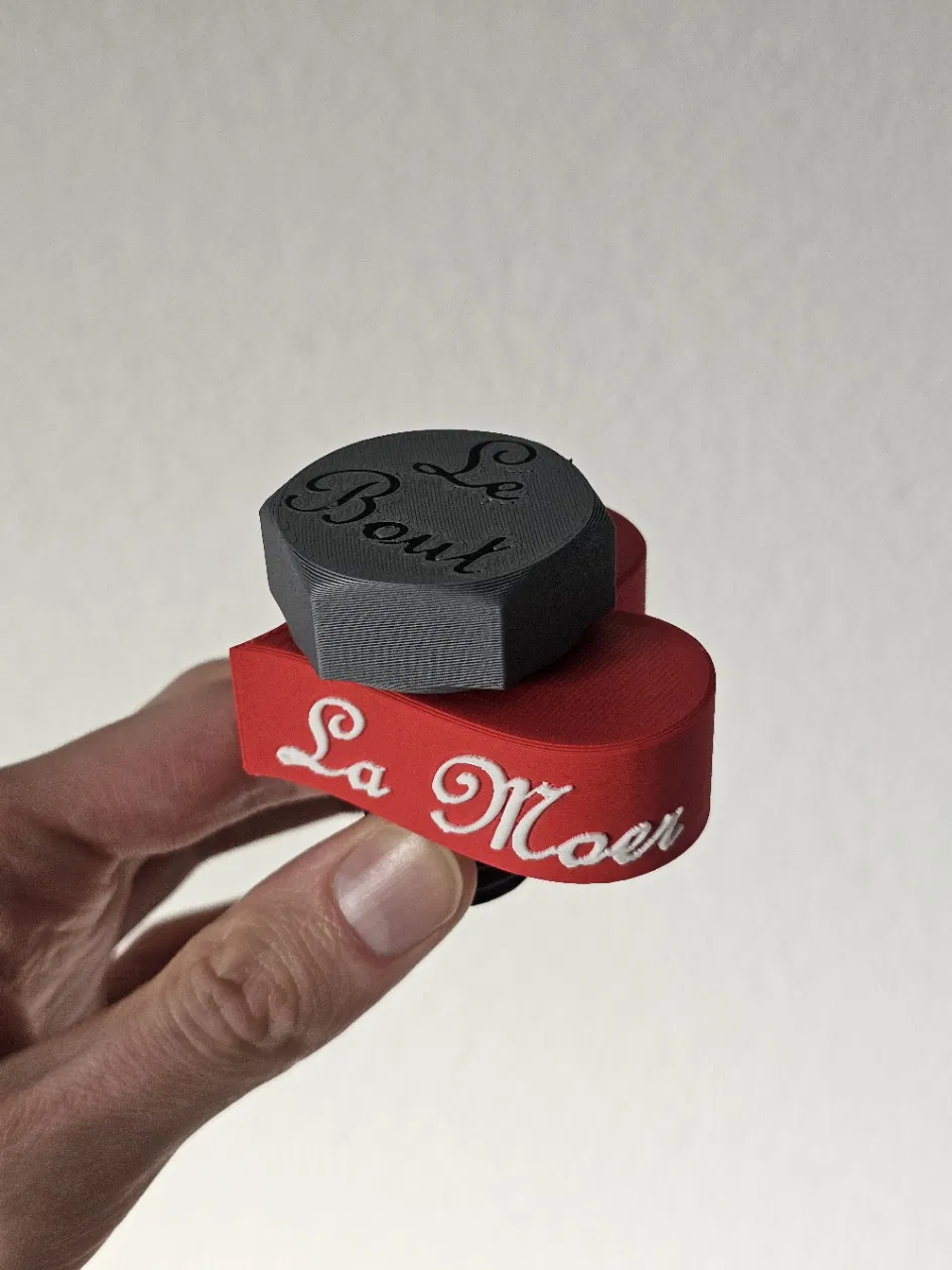 Mẫu chơi chữ giữa “moer” (tiếng Hà Lan: nut/ê-cu) và L’Amour (Pháp). La Moer & Le Bout có thể screw vào nhau; bản Mini fit ren M12 (nozzle 0,25mm), bản XL scale 200% và in multi colour với nozzle 0,4mm.
