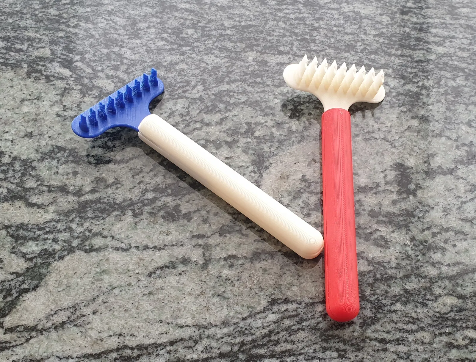 Striegel chải lông nhỏ cho mèo lông dài và chó nhỏ. In bằng PLA nên ấm tay, dễ chịu hơn loại kim loại. Tay cầm gồm 2 nửa, cần dán keo để hoàn thiện. Có thêm biến thể bản lớn hơn.