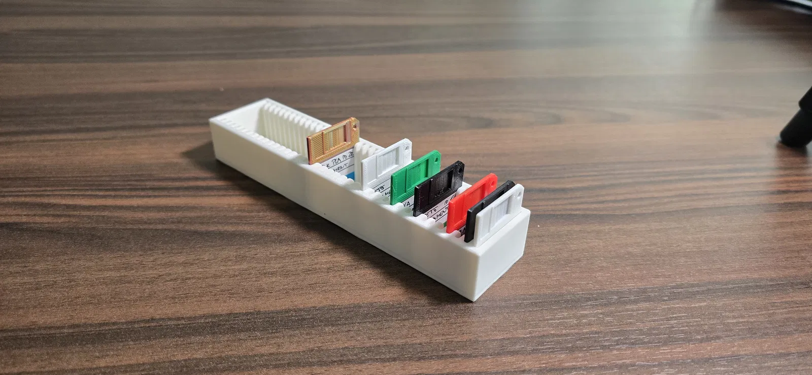 Khay đựng giúp bạn sắp xếp mẫu filament dạng floppy disk ngăn nắp, có khe riêng cho từng đĩa. Chứa tối đa 40 mẫu, phù hợp cho các bộ mẫu do @BeaRes thiết kế.