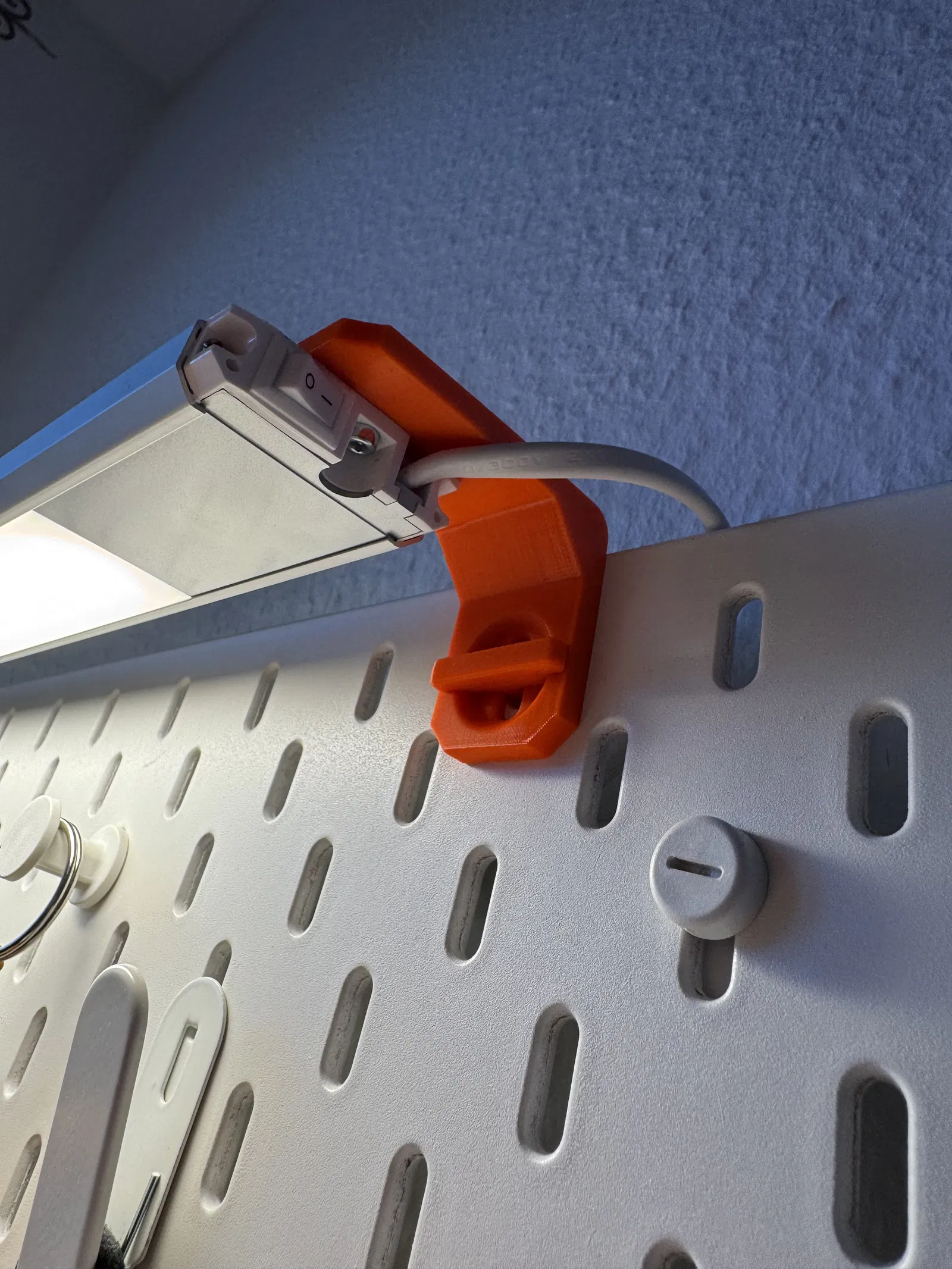 Mình thiết kế món này để gắn đèn của mình lên hệ Ikea Skadis. Mình dùng kiểu top mount để có vị trí tối ưu, nhưng cũng có thể lắp ngược lại.
