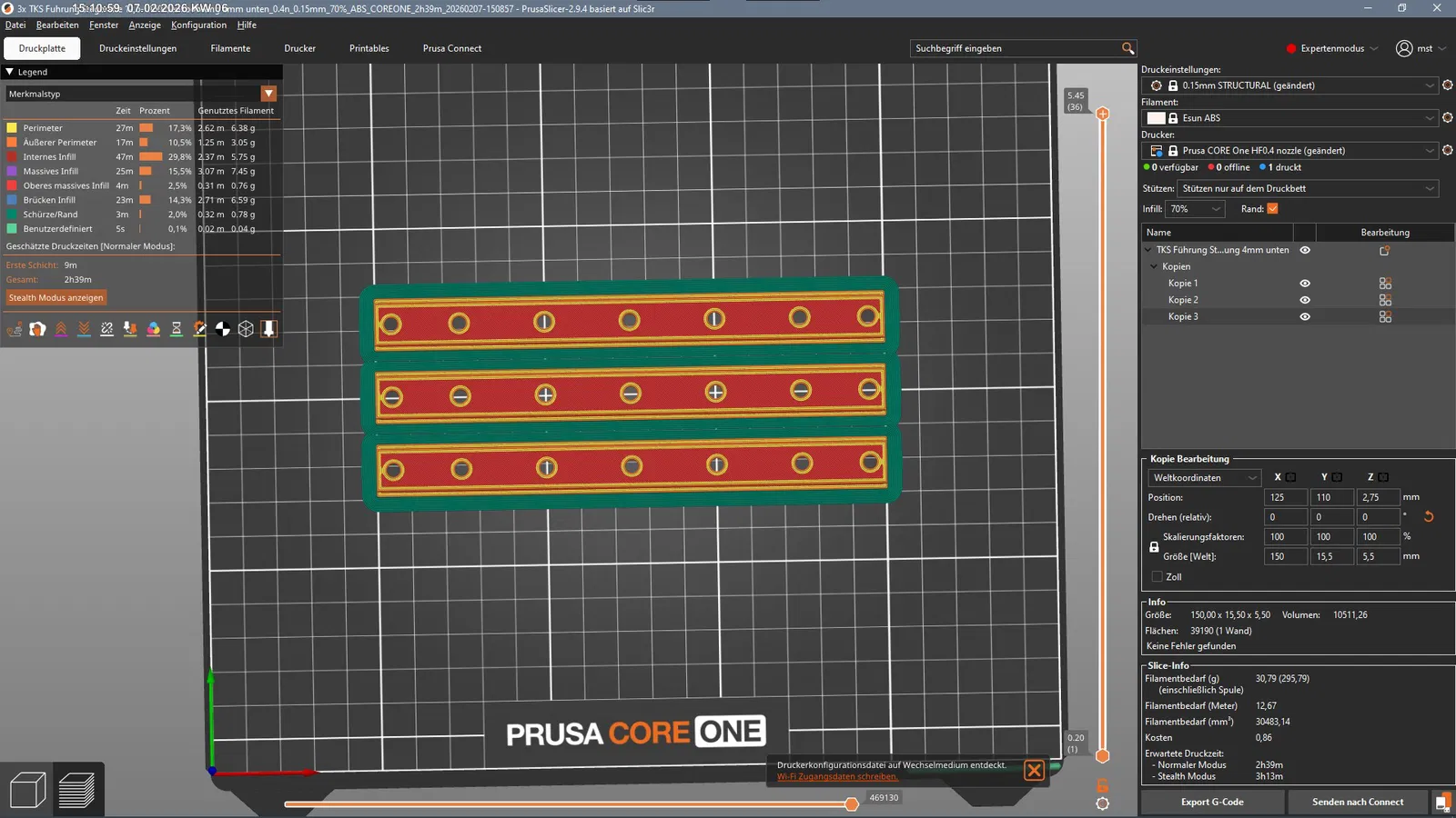 Mình in bằng eSun ABS+, layer height 0,15mm (Structural), 70% infill kiểu honeycomb 3D.