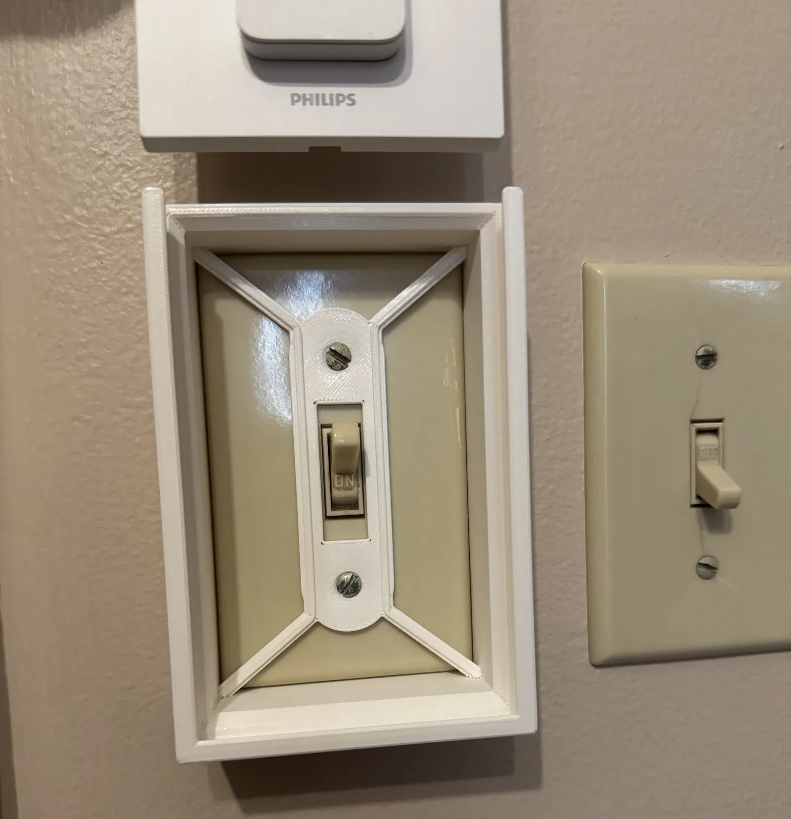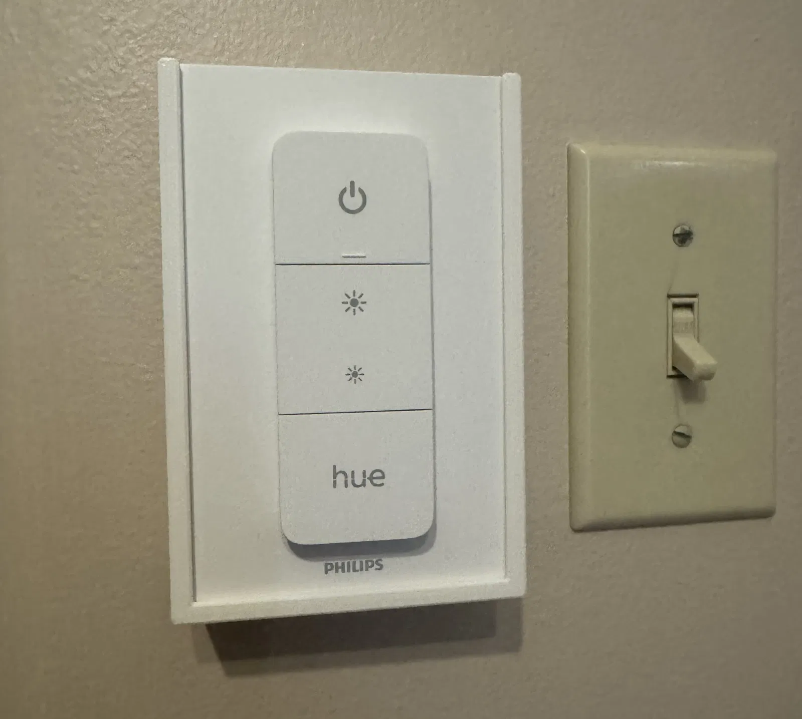 Mình làm cái cover này để giữ remote Philips Hue (V2) và khỏi phải tháo cái mặt che công tắc (wall plate) gốc trong căn hộ. Chỉ cần in ra rồi dùng đúng ốc sẵn có để bắt cố định vào. Cái ngàm nam châm (magnetic holder) zin của Hue chỉ việc trượt vào từ phía trên.