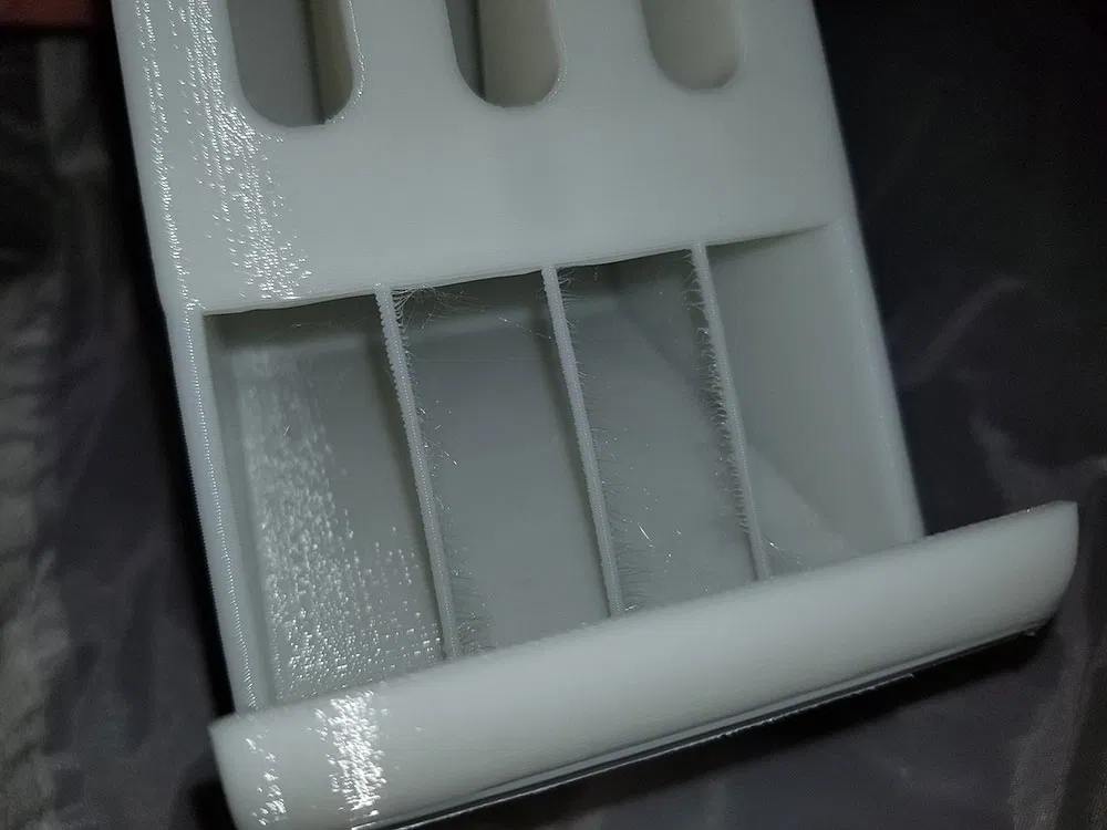 Giữ được 10 cuộn túi và có lỗ bắt vít để gắn lên tường, hoặc dùng băng keo hai mặt/Command Strips để dán. Mỗi cuộn túi đường kính khoảng 30mm và rộng 61mm, nên cái dispenser này có thể cũng hợp với các loại khác. Ban đầu mình thiết kế không có cái mặt nghiêng “lạ” bên trong, nhưng trước khi thêm phần đó thì mình thấy các cuộn hay bị kẹt vào nhau và cứ “treo” lại, không tự lăn xuống để nhả túi. Mặt nghiêng này được đỡ từ bên dưới bằng một mặt nghiêng khác có độ dốc đủ lớn nên không cần supports. Theo mô tả trên Amazon, cuộn túi cho chó là loại 15 cuộn, mỗi cuộn 9x13". Model đã có sẵn sacrificial supports ở phần miệng mở, nên bạn không cần phải lăn tăn chỉnh support settings trong slicer.
