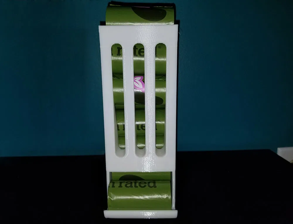 Dispenser gắn tường chứa 10 cuộn túi Earth Rated (cuộn ~30mm đường kính, 61mm rộng). Có lỗ bắt vít hoặc dán bằng băng keo/Command Strips. Thiết kế mặt nghiêng chống kẹt, có sacrificial supports dễ tháo.