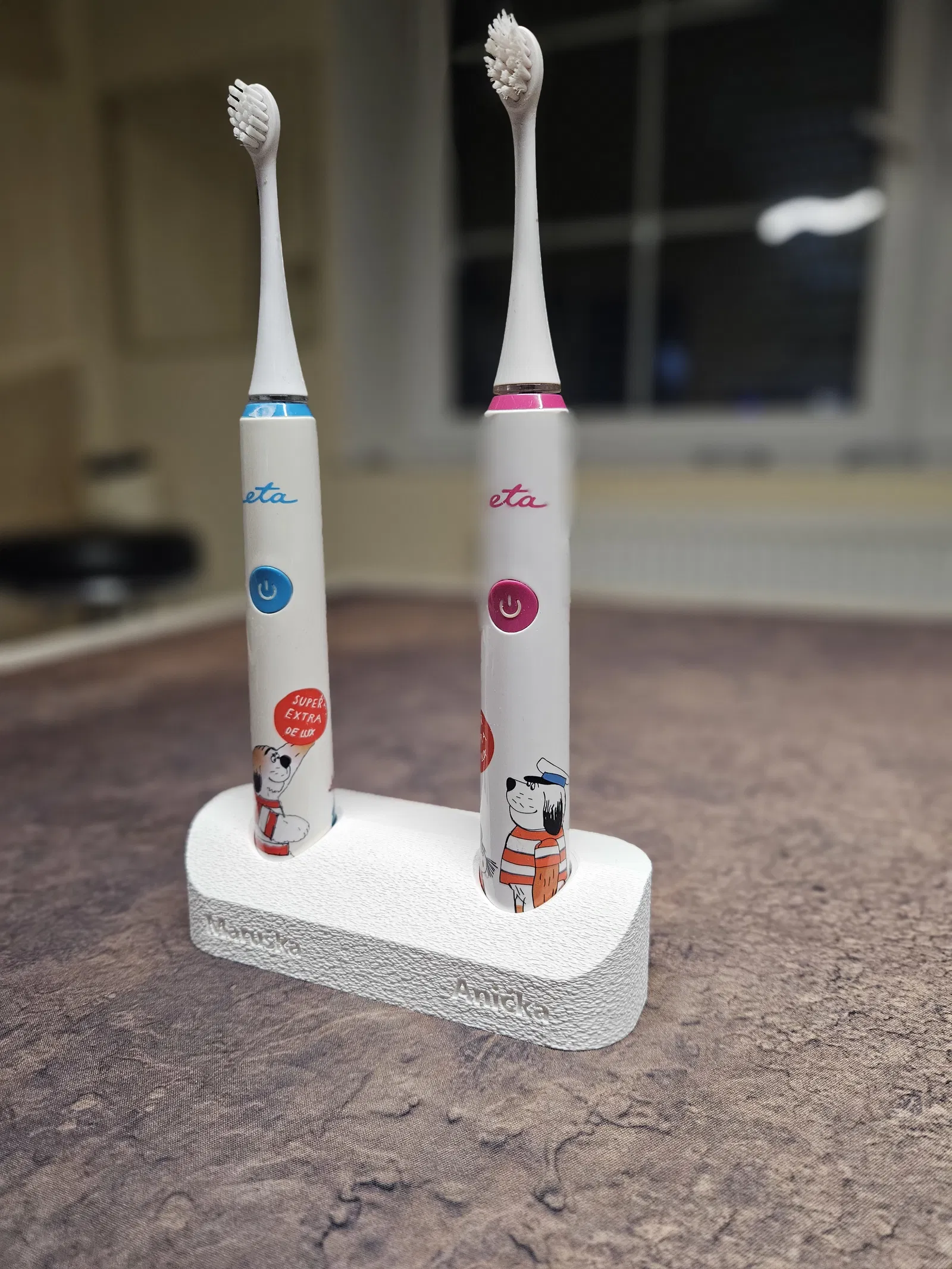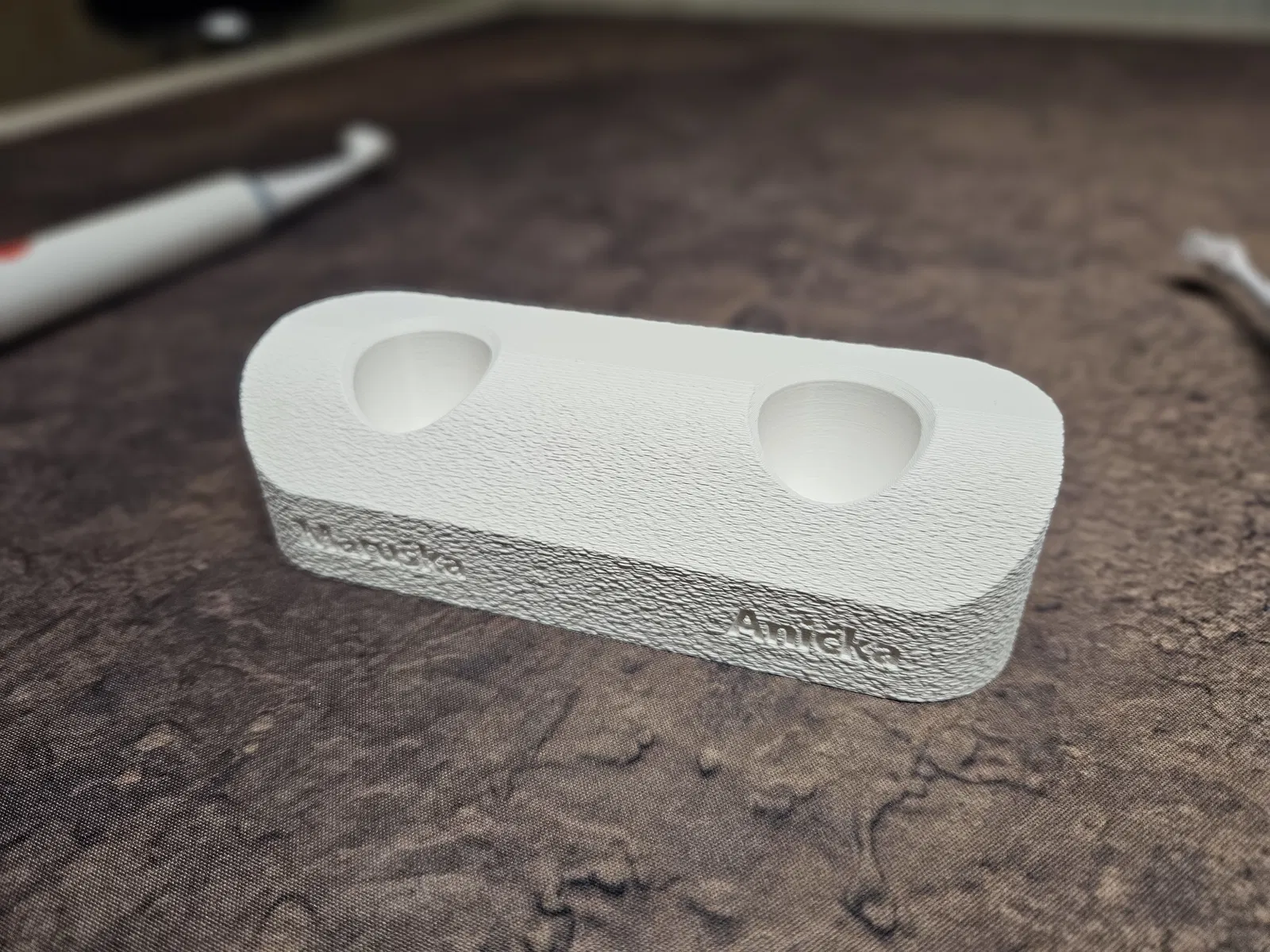 Mình ngán cảnh tụi nhỏ để bàn chải điện lung tung khắp phòng tắm, nên làm cái kệ đôi này để giải quyết gọn. Mẫu đầu tay, chưa hoàn hảo; không cần supports, có fuzzy skin và nameplate chỉnh trong slicer.
