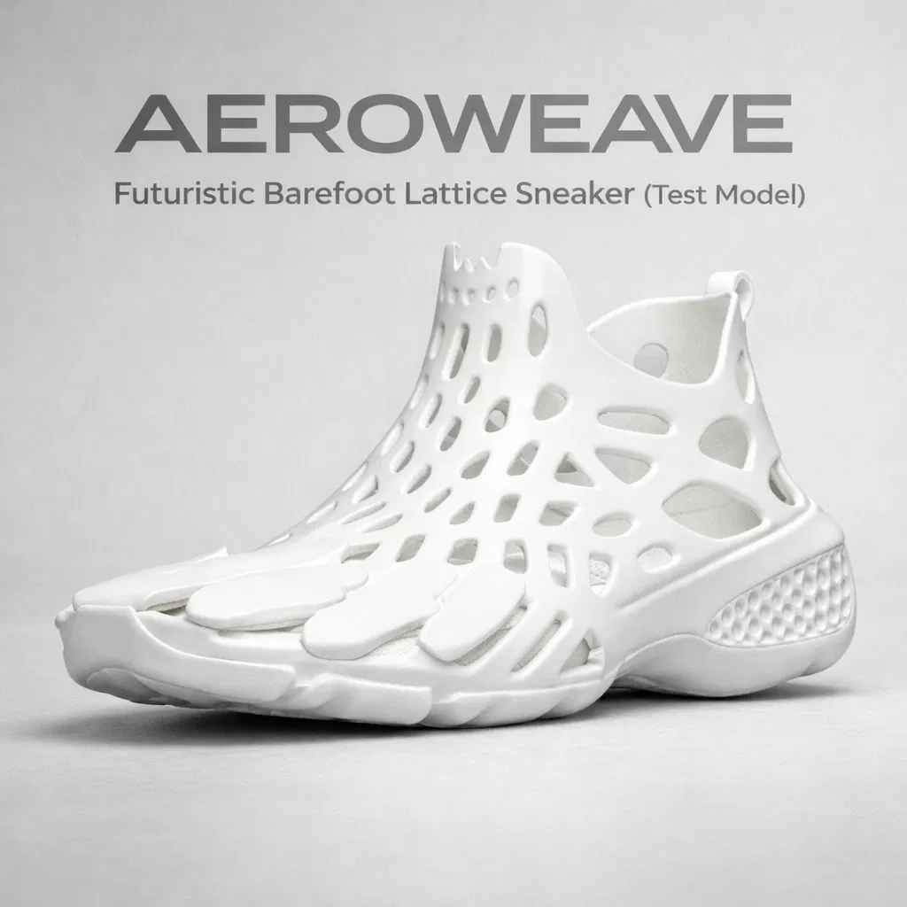 AEROWEAVE là concept sneaker barefoot kiểu tương lai với cấu trúc organic lattice/Voronoi và thiết kế tách ngón. Chỉ là TEST MODEL, chưa kiểm thử độ êm, độ bền hay khả năng đi bộ; phù hợp in prototype, thử nghiệm, cosplay.