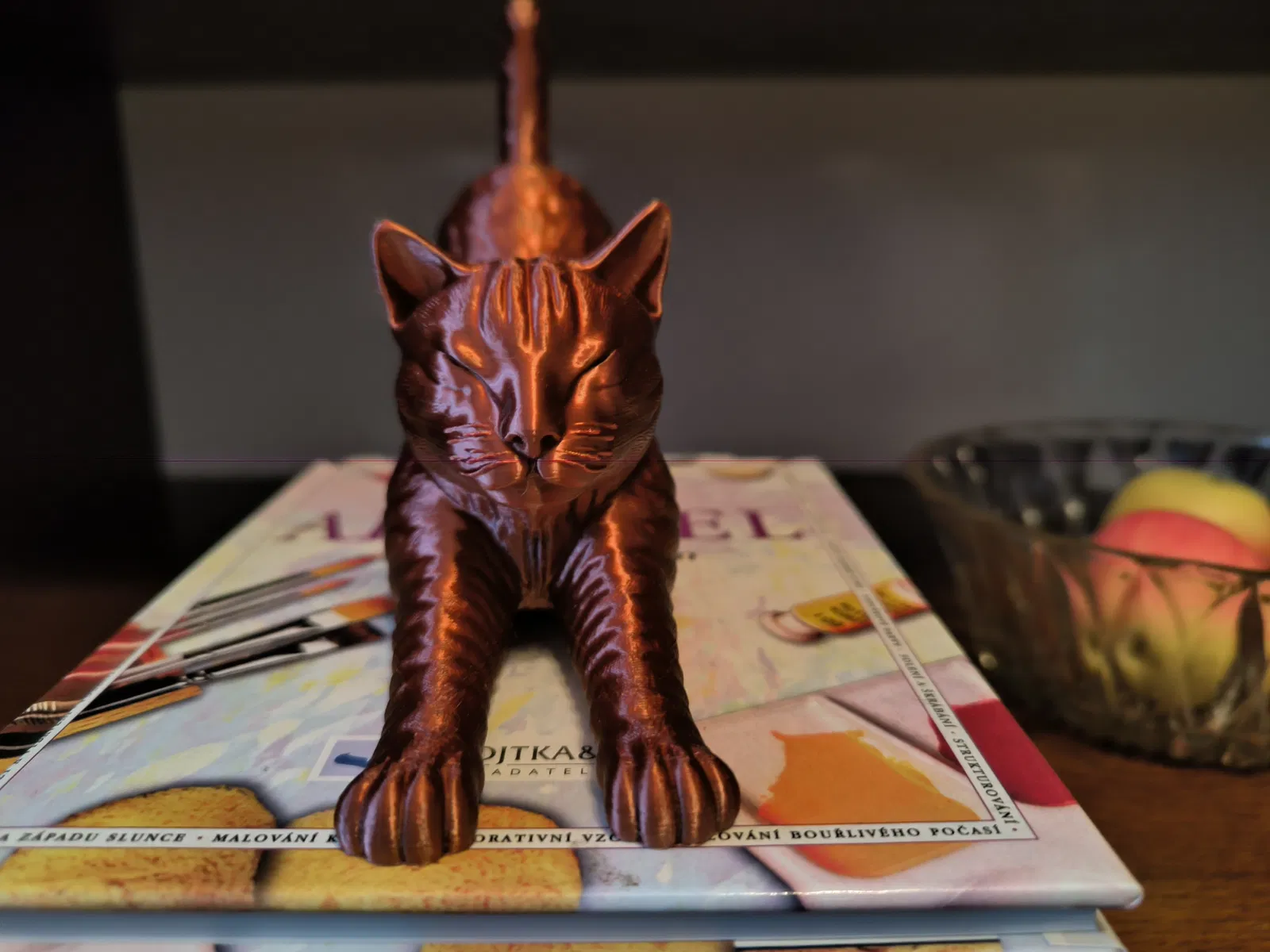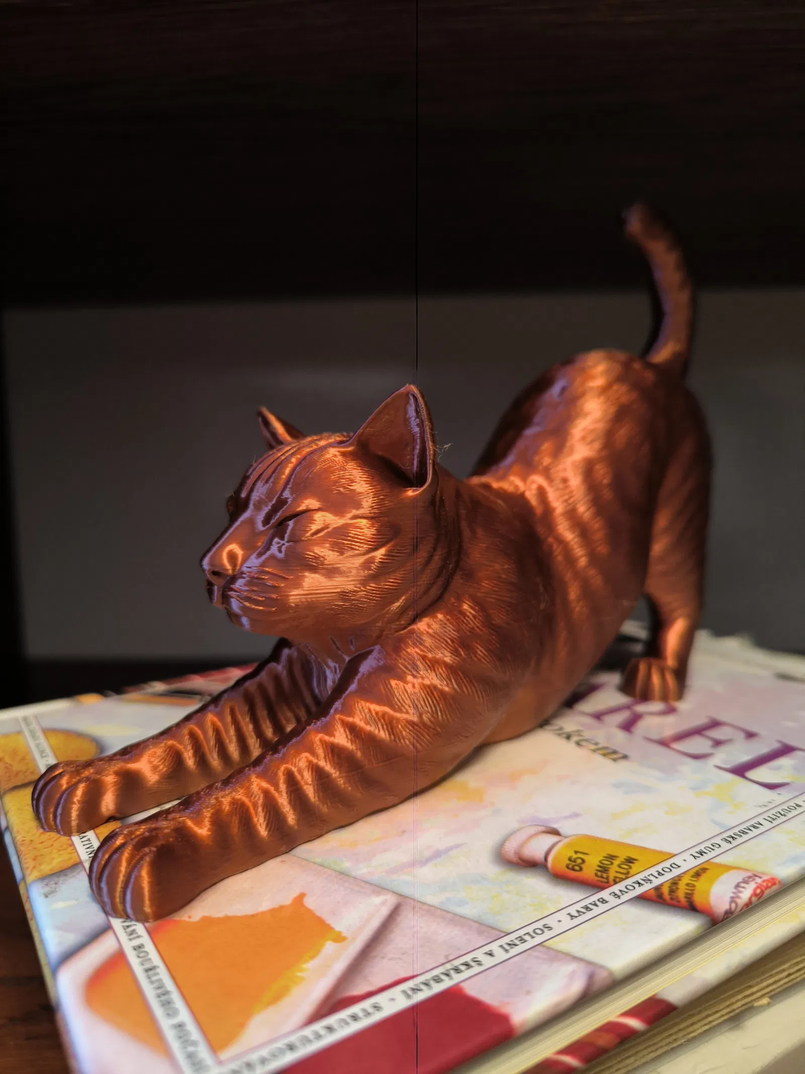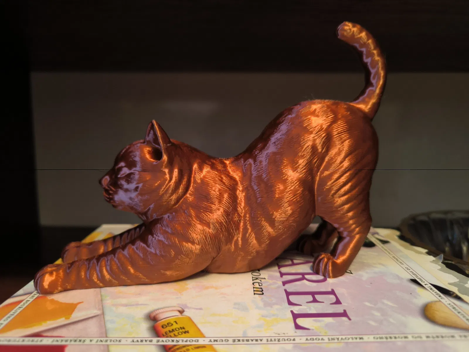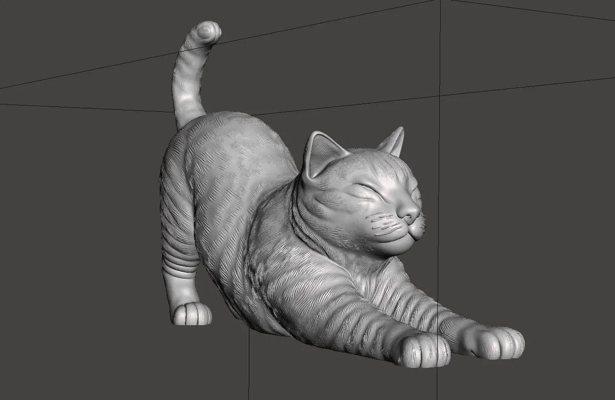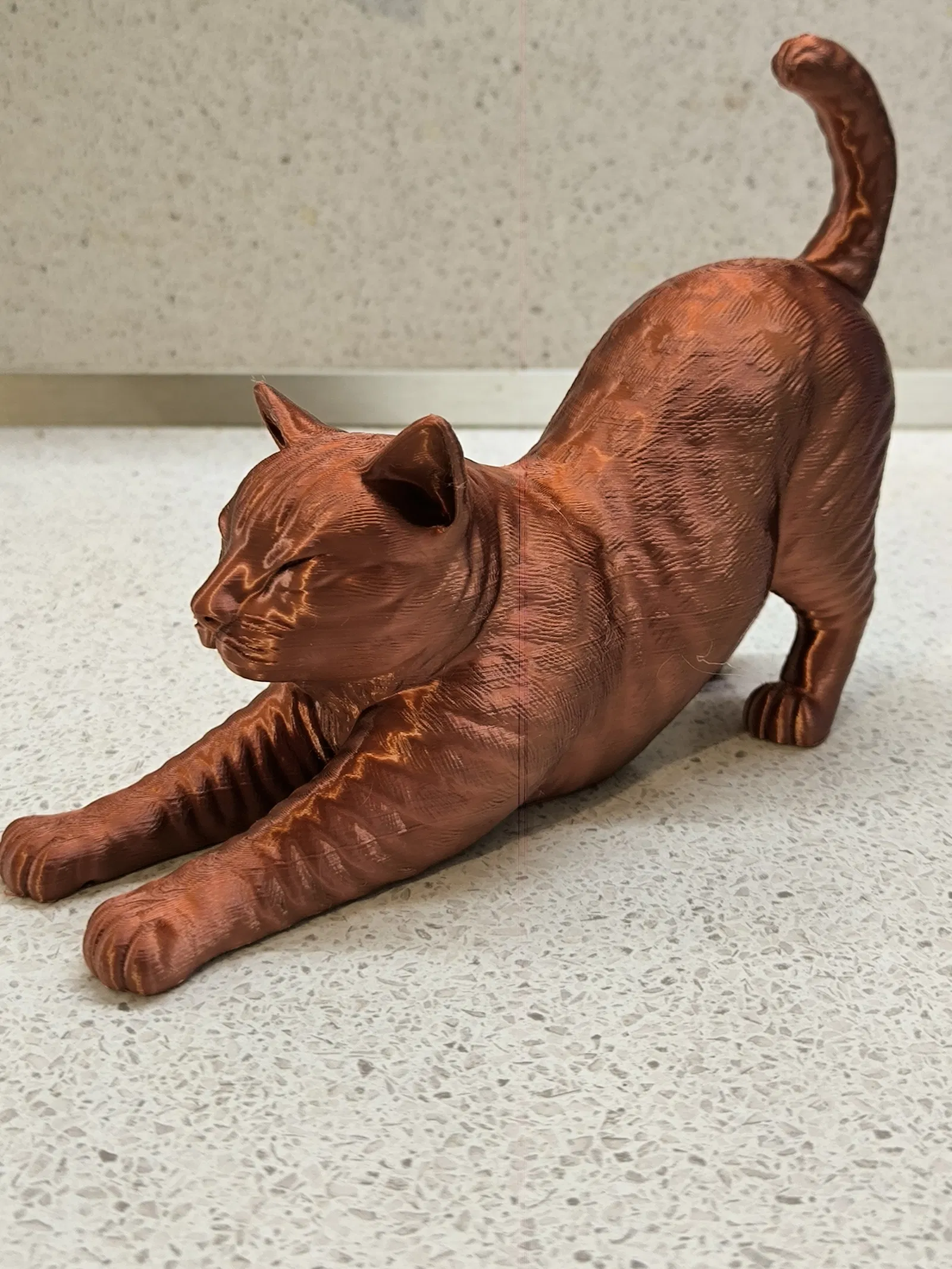 Mẫu Stretching Cat là một món trang trí đơn giản, dễ thương, được tạo theo yêu cầu vì khó tìm mẫu phù hợp trong các kho miễn phí. Gợi ý in: PLA, layer 0.2mm, 2 walls, 8% gyroid, brim, tree supports Automatic (28–30°).