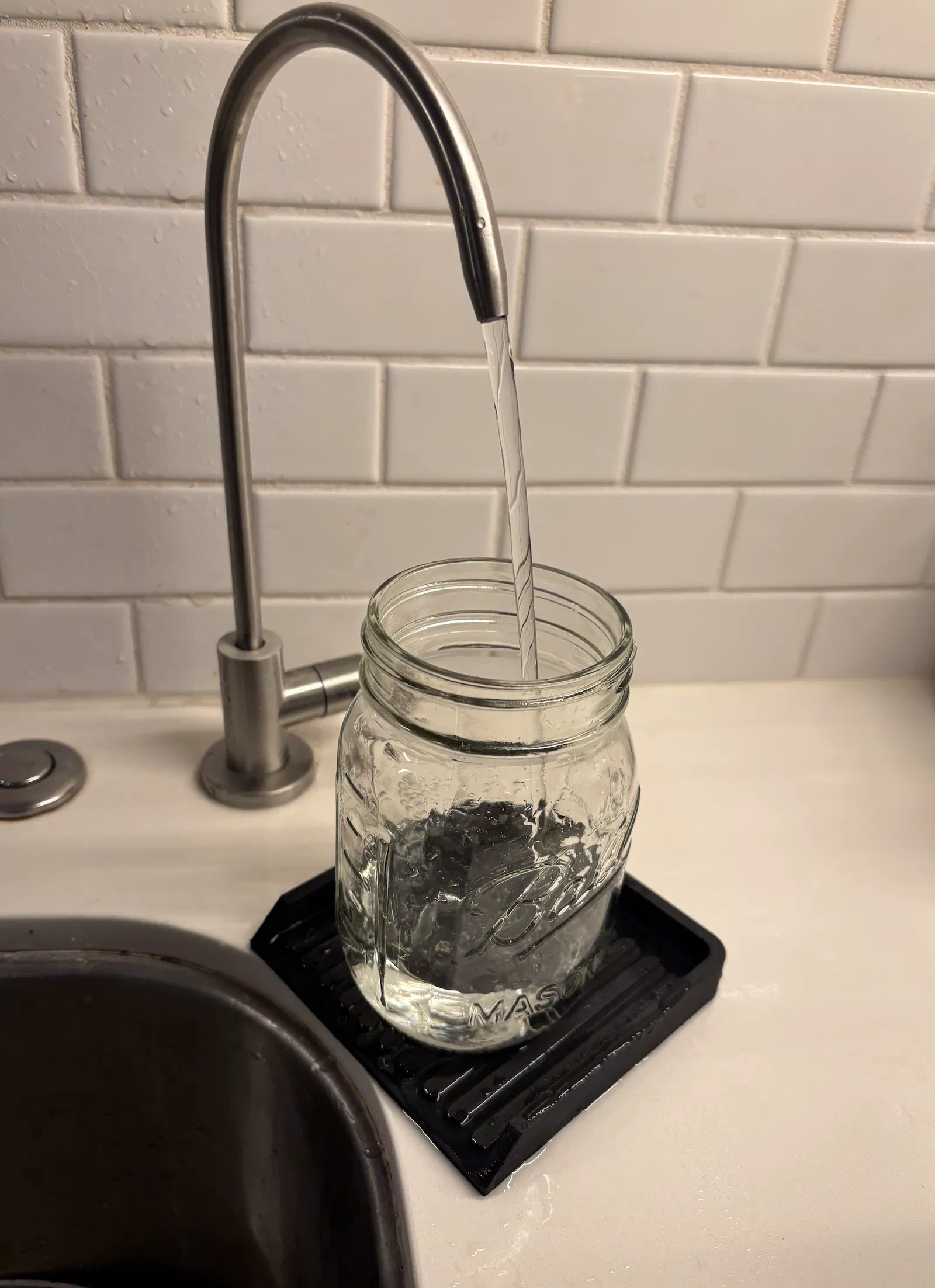 Bộ lọc RO của mình chảy khá chậm, nên lúc đổ nước vào bình hay bị tràn làm bừa bộn hết. Món này giúp hướng dòng nước tràn về bồn rửa, đỡ làm dơ khu vực xung quanh.
