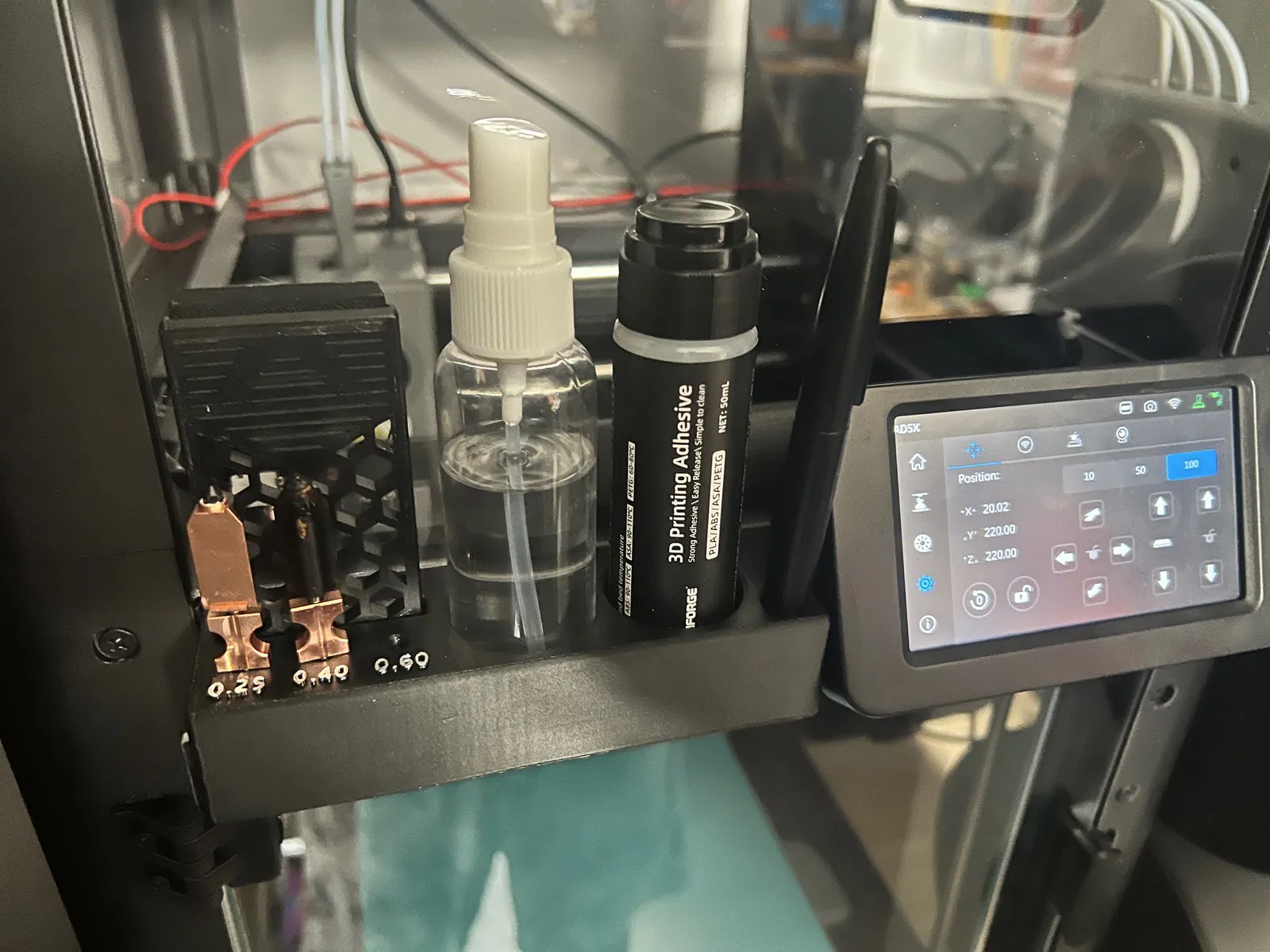 Có sẵn các vị trí để để bed scraper, keo dán bed, chai xịt IPA, bút stylus cho màn hình, và 3 đầu phun (extruder nozzles). Mình thấy in cái này ngon nhất là dùng standard grid supports kèm top interface 3 lớp.