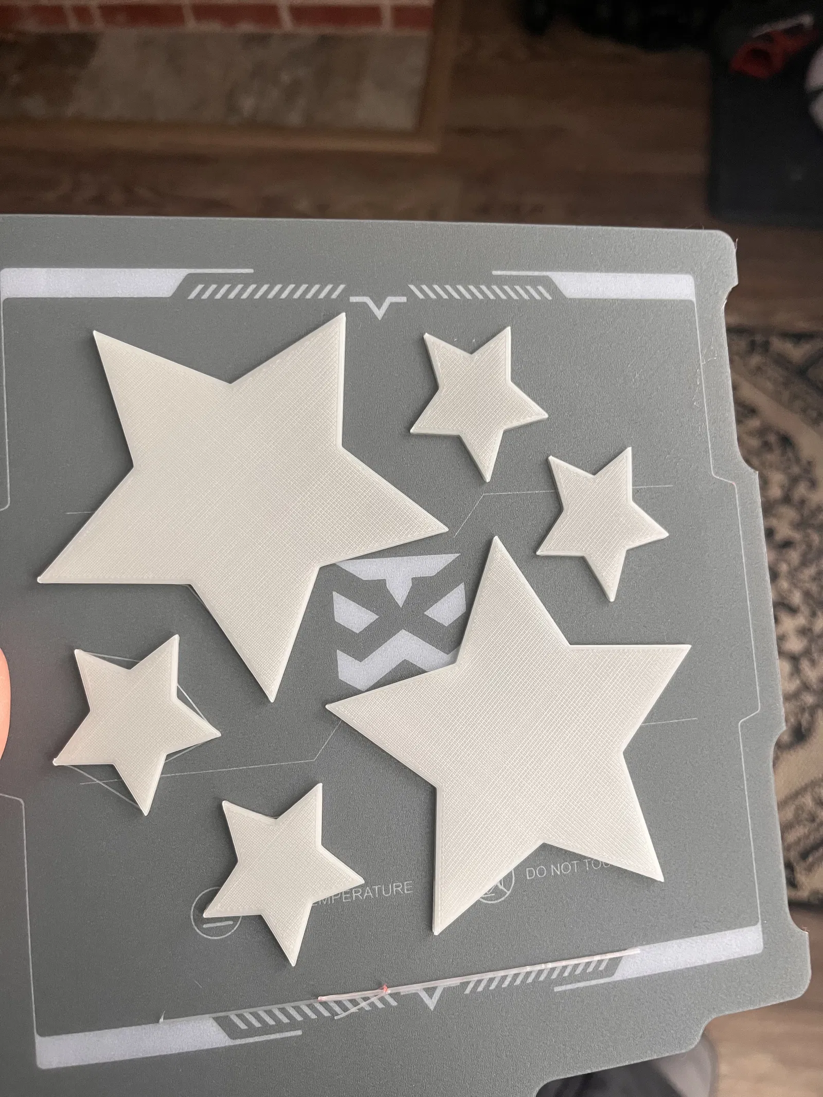 Bộ ngôi sao in 3D phát sáng trong bóng tối, làm để trang trí phòng cho bé. In trên AOSEED X-Maker 150x150mm với filament Sunlu PLA blue-glow. Khi scale, nhớ giữ độ dày ngôi sao ở 1.2mm.