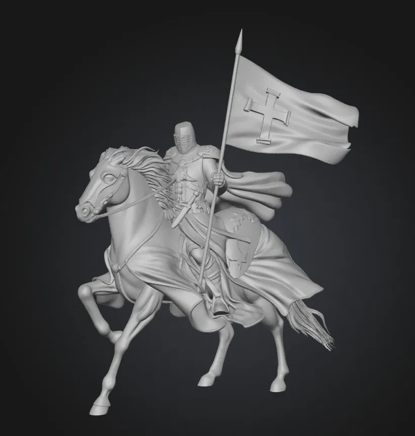 Mẫu 3D Hiệp sĩ Dòng Đền (Knight of the Templar) cưỡi ngựa, phong cách trung cổ, hợp chủ đề crusader/knight/warrior. Phù hợp để trưng bày, sưu tầm hoặc làm mô hình tabletop sau khi in.