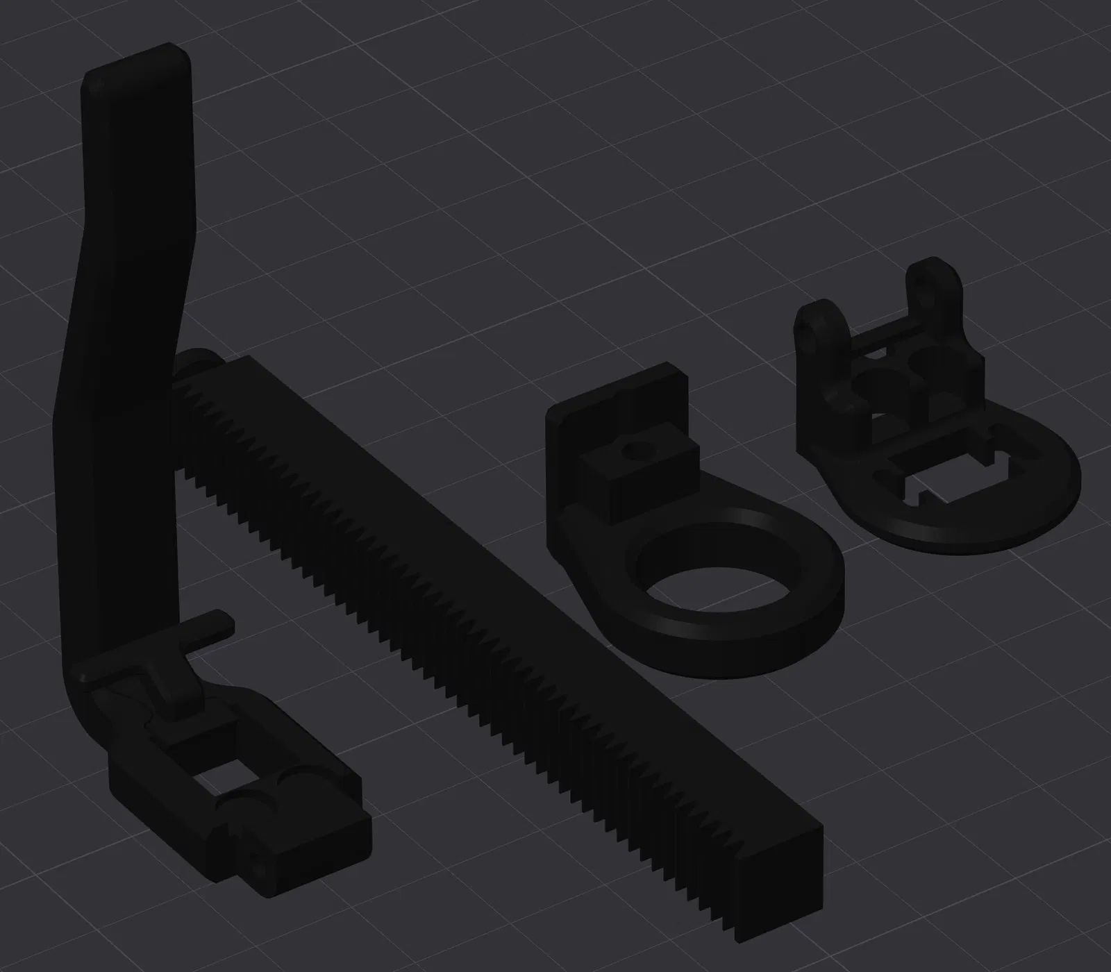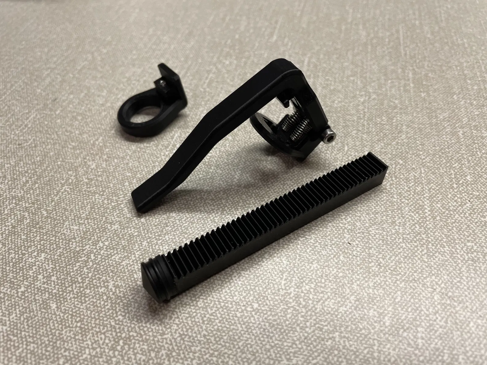 Cơ cấu cóc có một “lưỡi” (tongue) đàn hồi để nhảy sang răng kế tiếp trên ty đẩy (plunger). Chức năng của nó dựa vào ma sát tác dụng lên plunger, thường là do đầu cao su của plunger tạo ra; tuy nhiên phần “retainer grippers” có thể in bằng TPU để tạo ma sát này nếu cần — còn không thì không cần dùng.