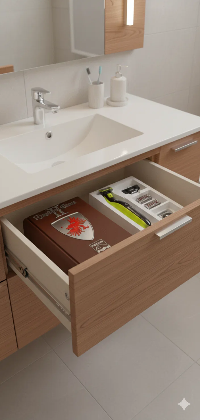 Mẫu “sách rỗng” có ngăn kéo dùng để cất gọn Philips OneBlade cùng bộ sạc, các đầu cạo và phụ kiện. Gọn gàng, kín đáo, tiện để trên kệ hoặc bàn.