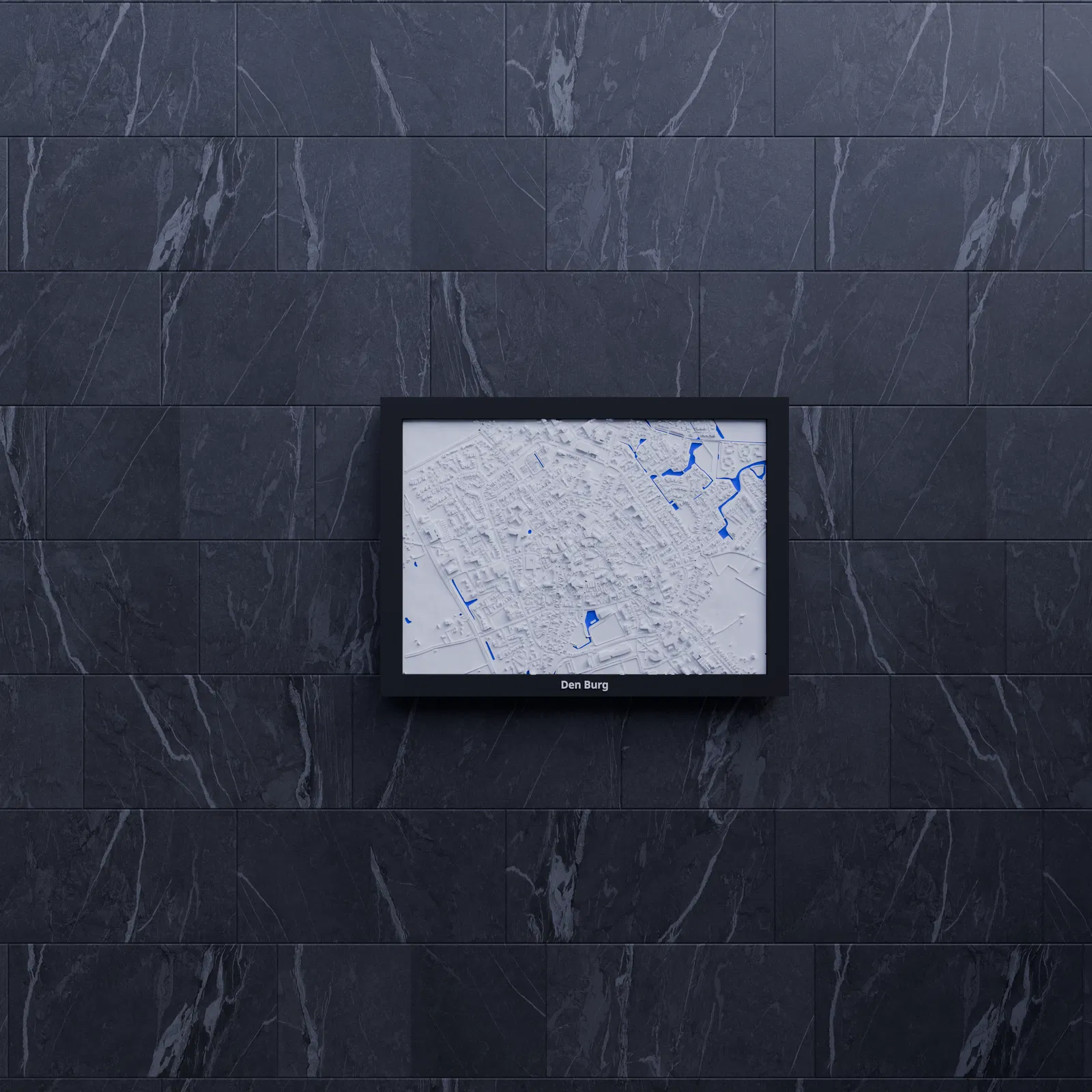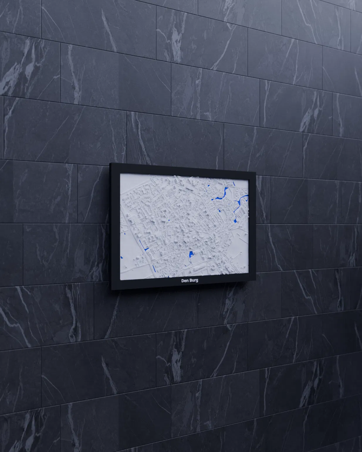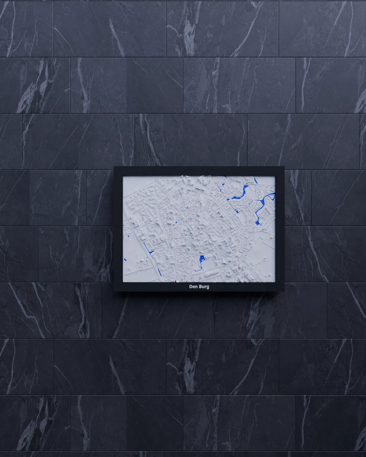 Bản thu nhỏ địa hình 3D tái hiện Den Burg (Hà Lan) từ dữ liệu địa lý, thu nhỏ từ 1.709×1.195 km xuống 170.5×119.5 mm (~10022:1). Có nhiều lựa chọn frame kèm lỗ treo, phù hợp trưng bày hoặc học tập.