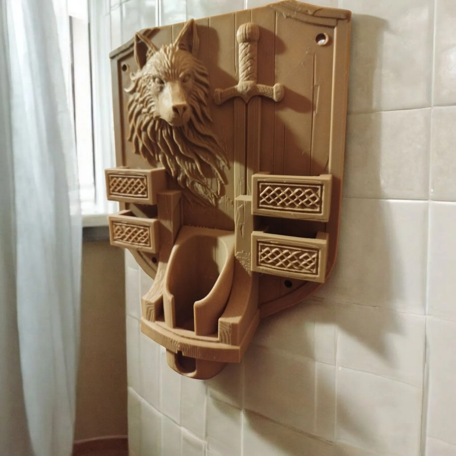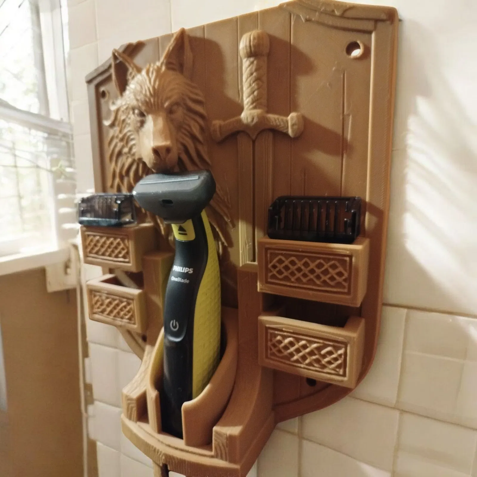 Giá treo tường Wolf Shrine cho Philips OneBlade 360 (QP4631/65), lấy cảm hứng Kingdom Come: Deliverance II. Dùng chân sạc Philips zin không cần độ chế, có chỗ để lưỡi thay, tối ưu in FDM với ít supports.
