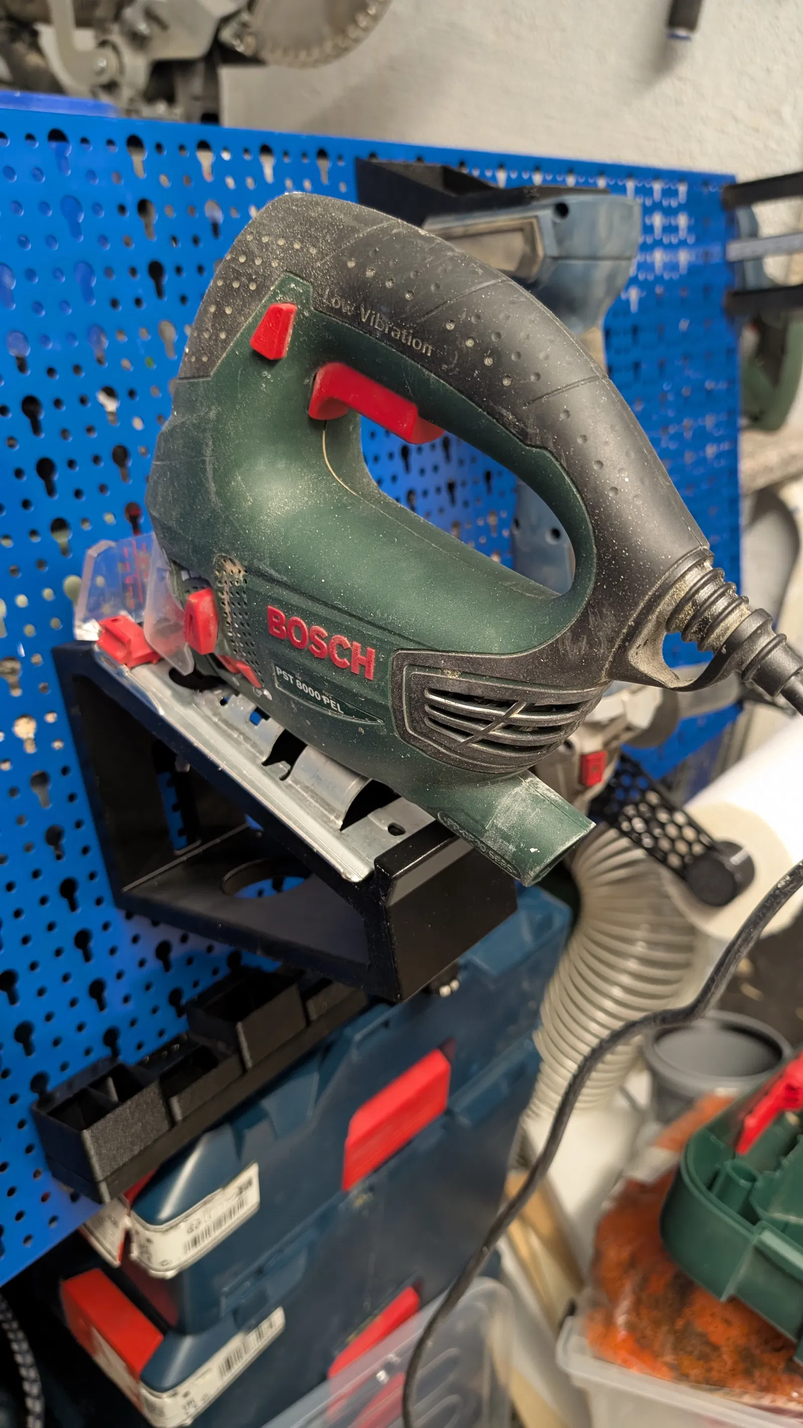 Holder gắn Peg-Board (Küpper) dành cho máy cưa lọng Bosch PST 800 / PST 8000 PEL. Mẫu này là bản chỉnh sửa từ French-Cleat Mount trên Thingiverse để phù hợp với Peg-Board.