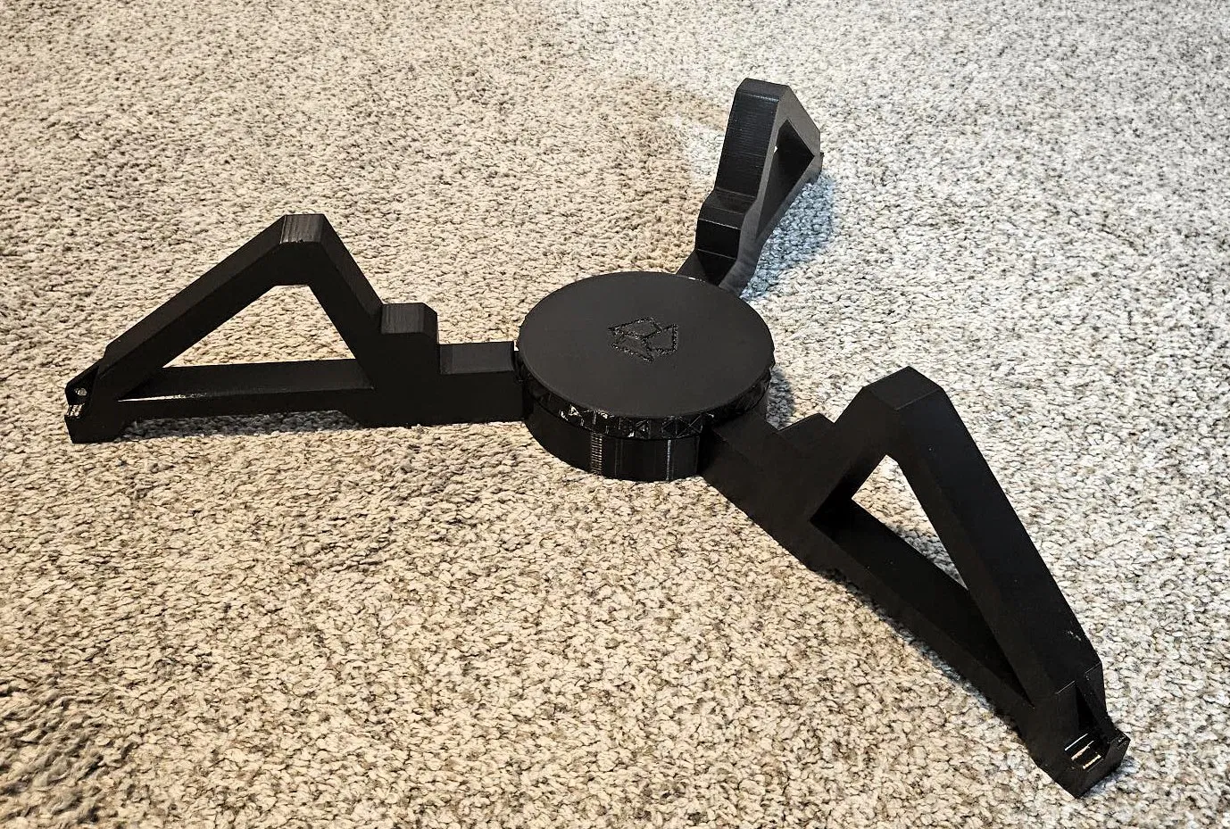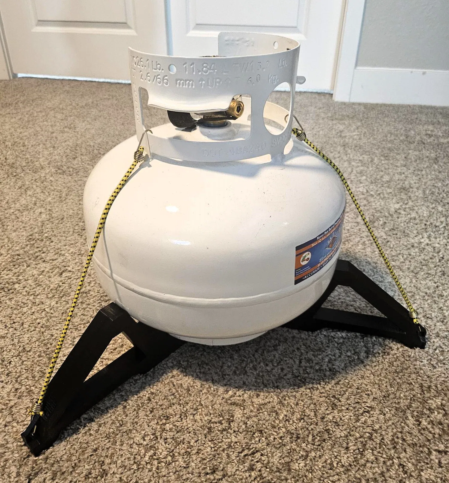 Chân đế modular cho bình propane 20 lb (cũng hợp bình 11 lb “squatty”), lắp ráp không cần dụng cụ, 3 chân đứng vững trên nền không phẳng. In PETG dùng ngoài trời, không cần supports, có điểm buộc dây bungie.