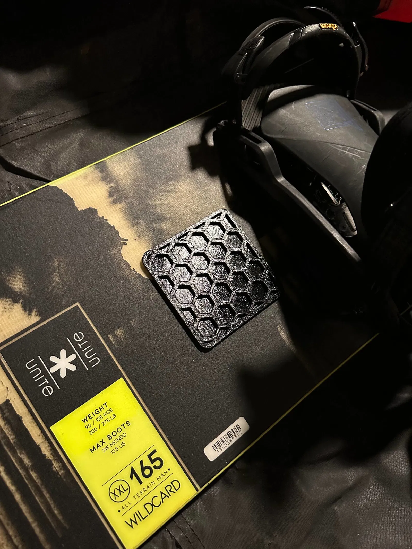Miếng stomp pad in 3D cho snowboard giúp tăng độ bám và kiểm soát khi trượt một chân không khóa binding. Tối ưu in TPU dẻo bền, chịu lạnh tốt; nhiều kiểu dáng, size chuẩn ~100×100 mm và dễ scale.