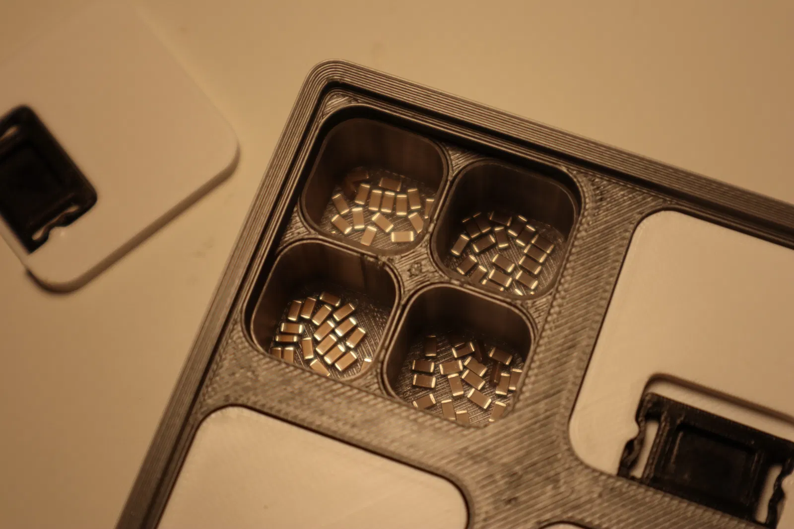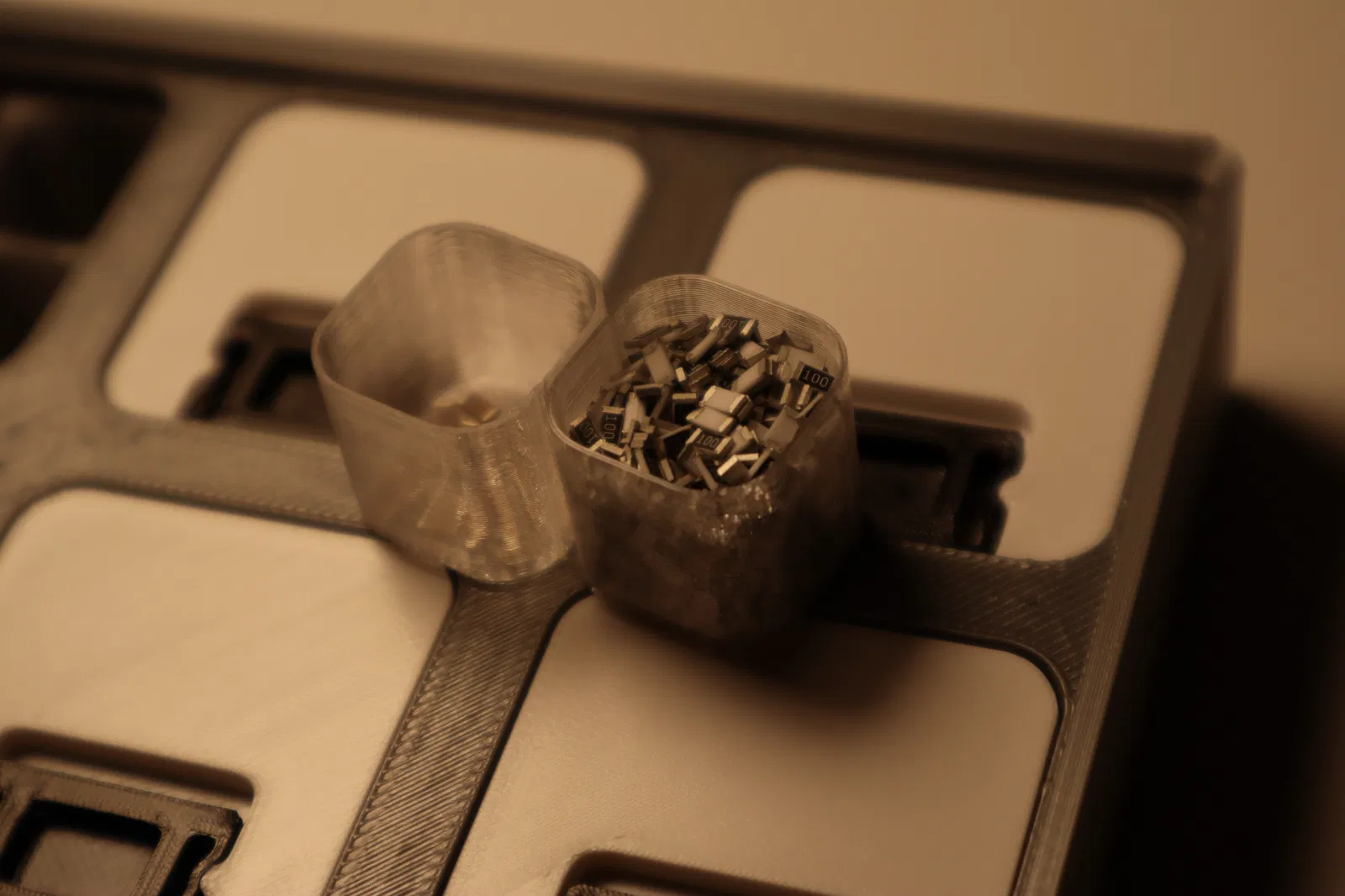 Vì sắp tới mình sẽ đặt mua một đống linh kiện SMD nên mình nghĩ cũng nên tính chuyện lưu trữ chúng cho gọn gàng (thay vì cứ để lộn xộn trong cuộn reel đi kèm :) ). Trước đây mình đã làm một mẫu Gridfinity để chứa linh kiện SMD rồi nhưng không thật sự hài lòng, vì mỗi lần muốn giữ chúng được sắp xếp ngăn nắp thì lại phải dời linh kiện qua lại, nhất là khi có thêm một giá trị mới, ví dụ như tụ điện. Dạo này mình cũng xem khá nhiều về compliant mechanisms nên đây đúng là thời điểm hoàn hảo để thiết kế một giải pháp mới!