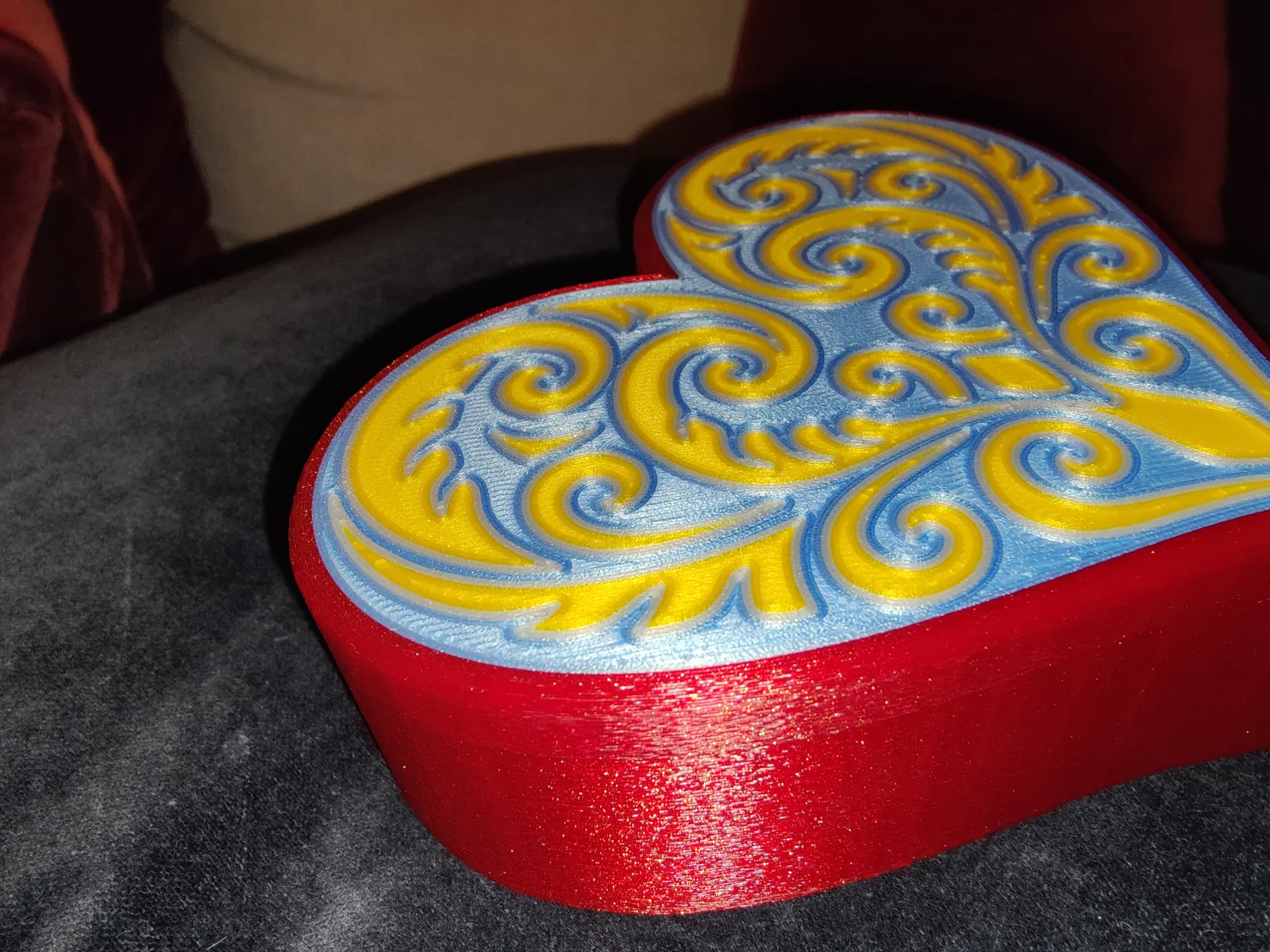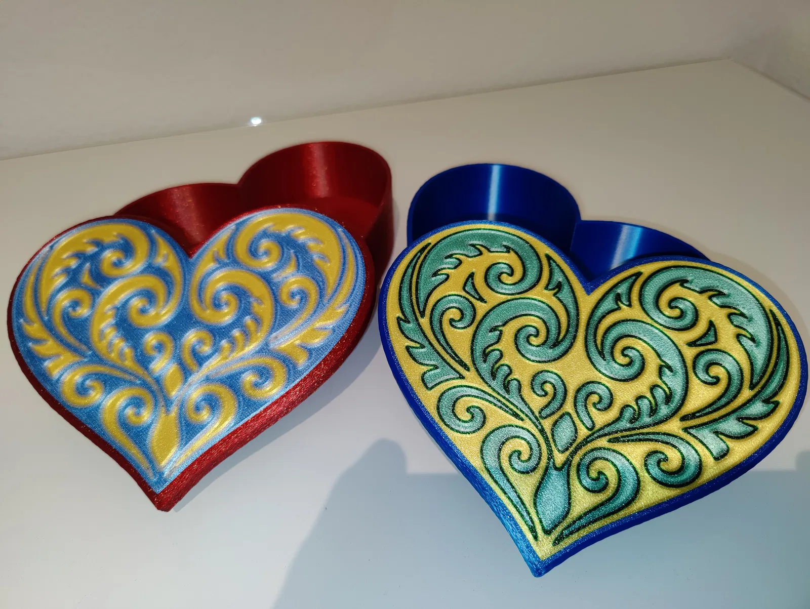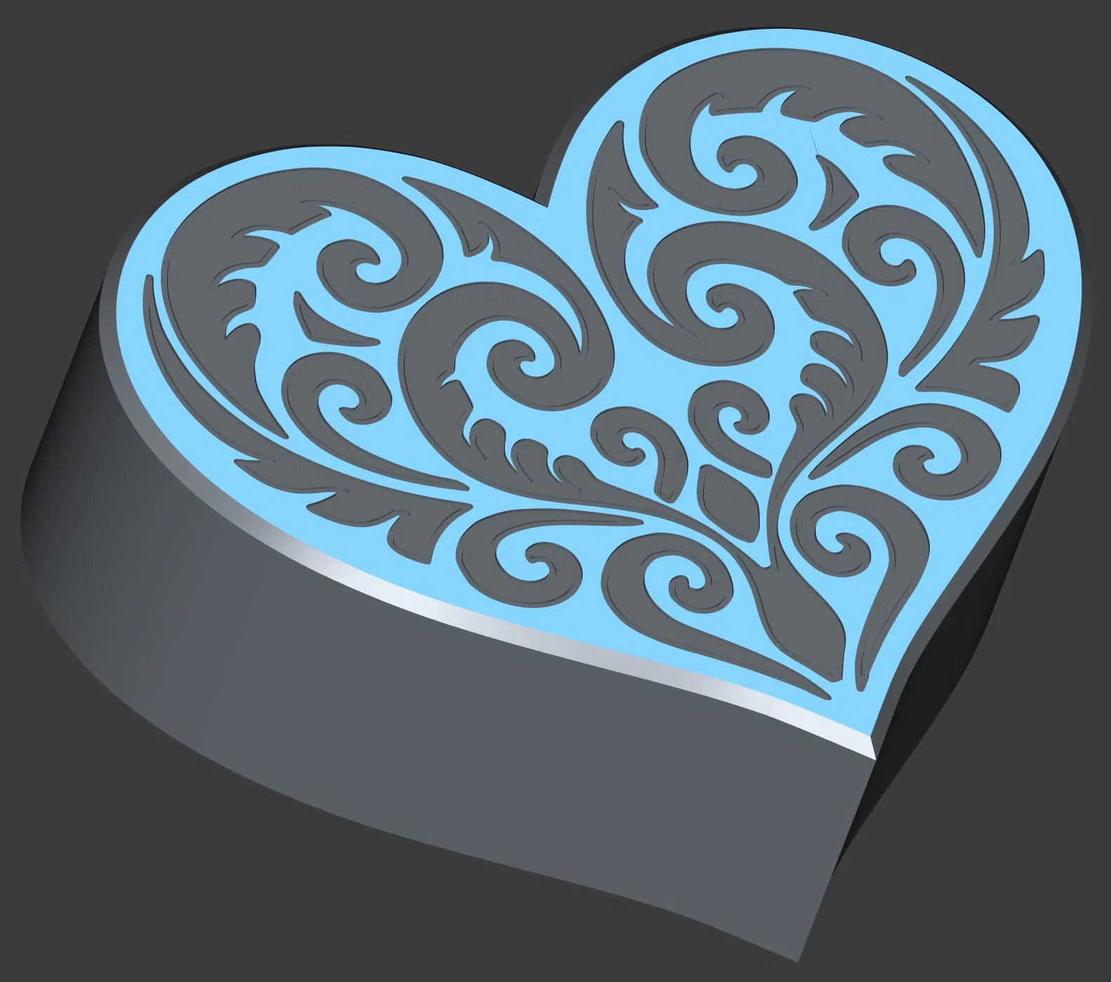 Hộp trái tim với nắp hoa văn Koru đối xứng, đúng chuẩn quà Valentine. Có 2 lựa chọn nắp: 4 màu (MMU/AMS) hoặc 1 màu; phần hộp in 1 màu. Khuyến nghị PLA, nozzle 0.4 mm, textured steel sheet.