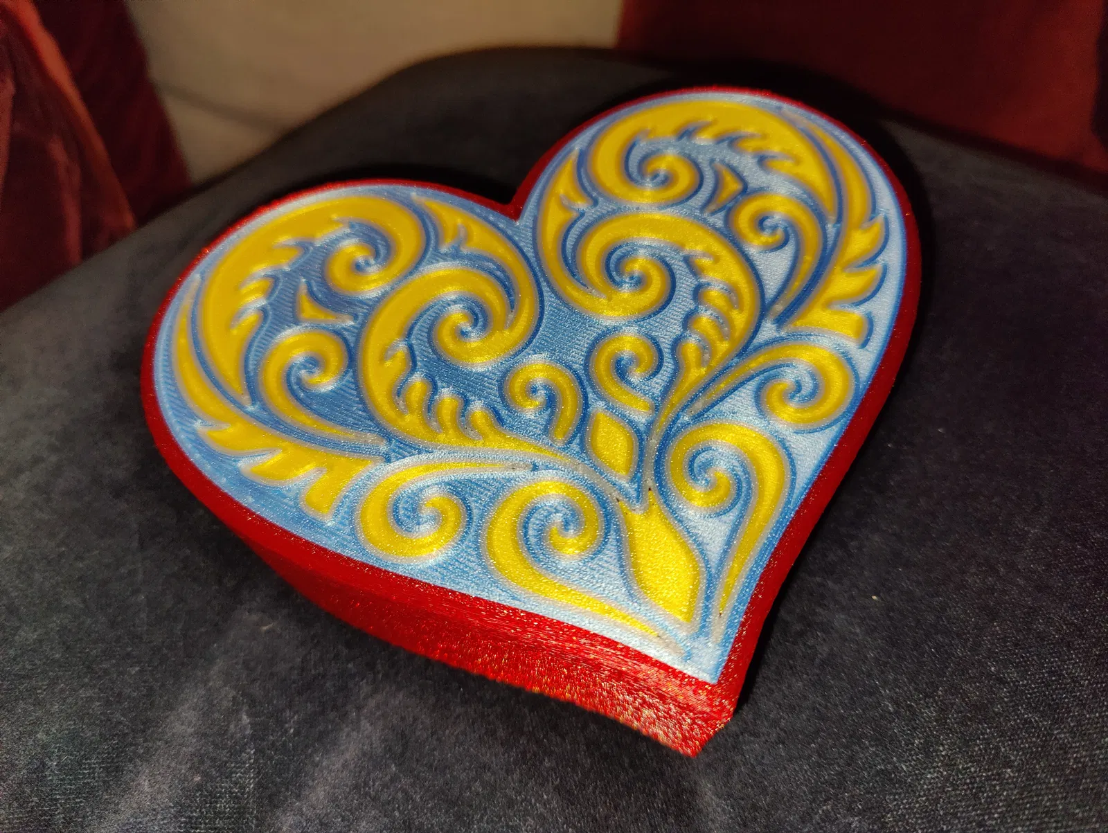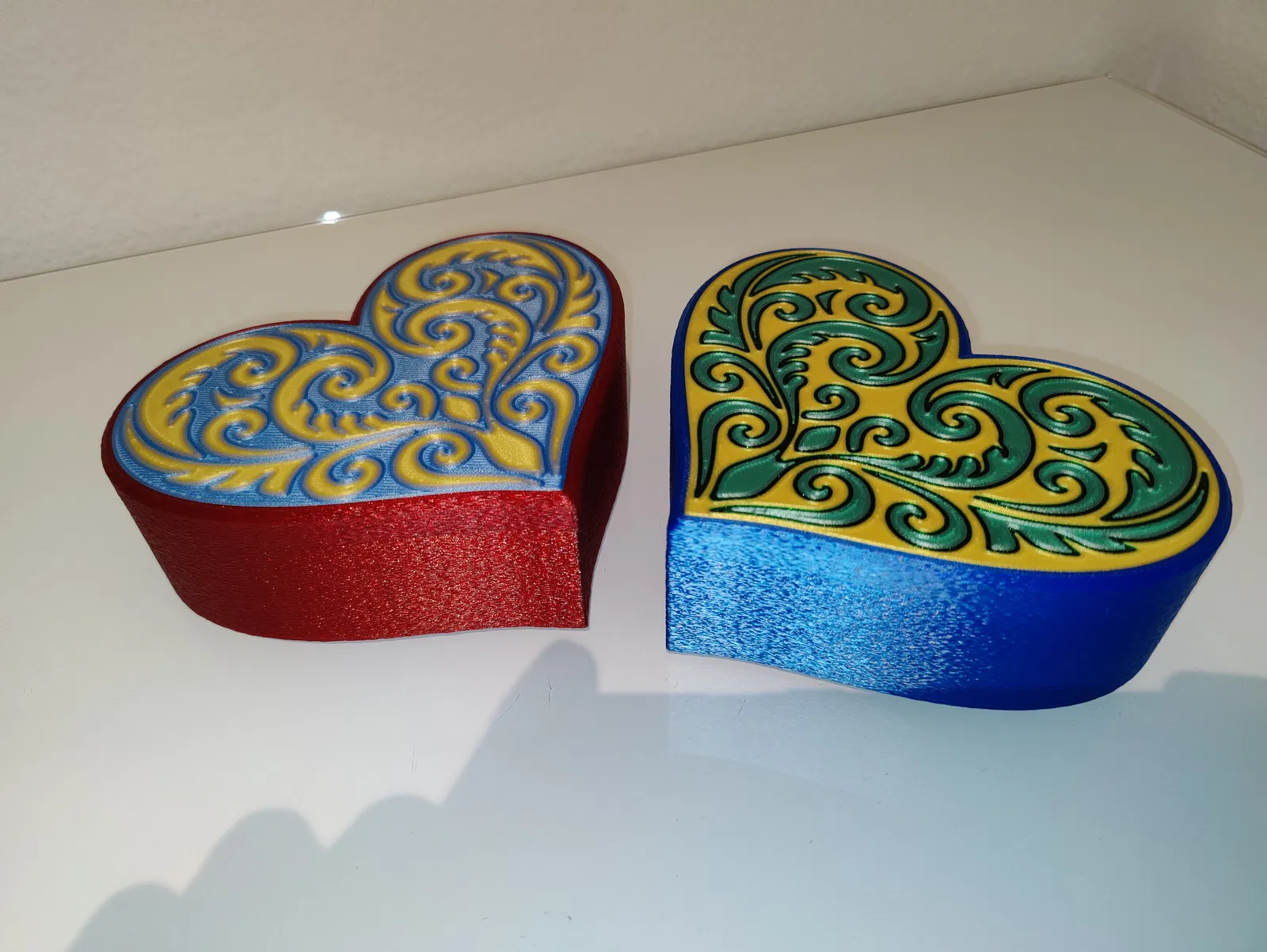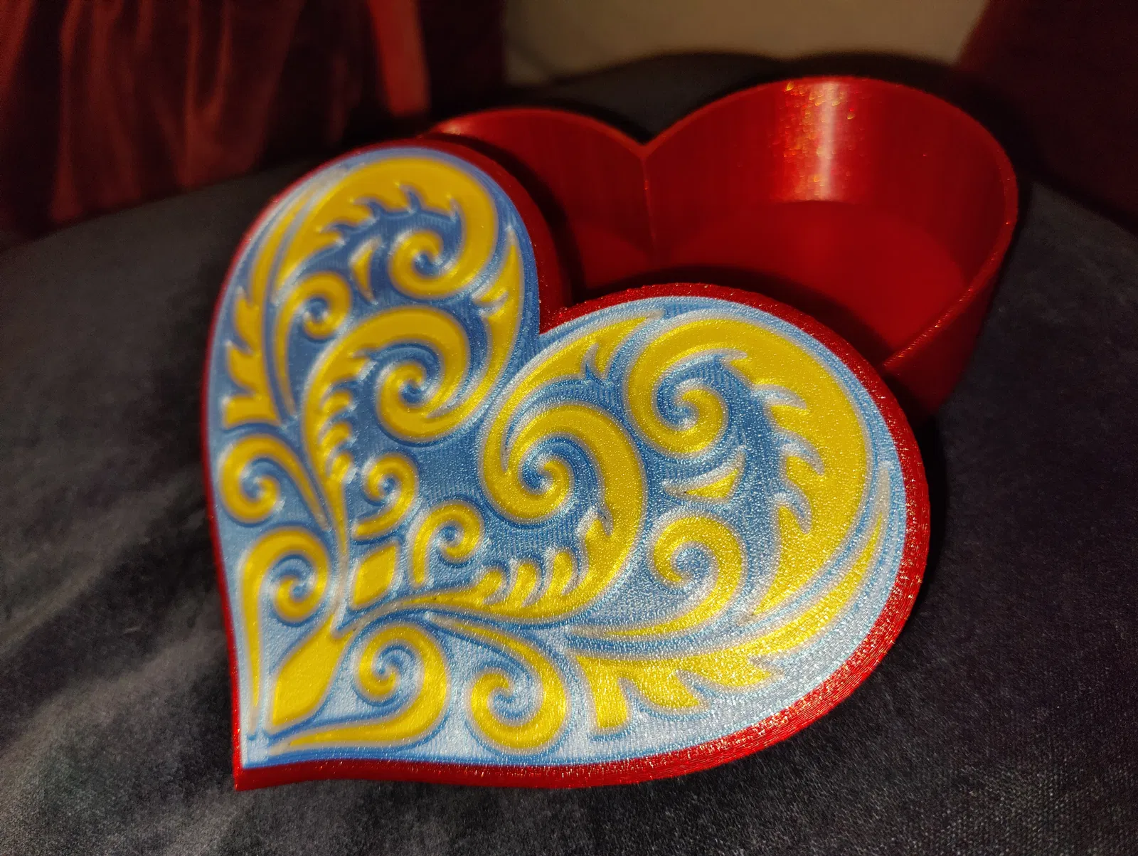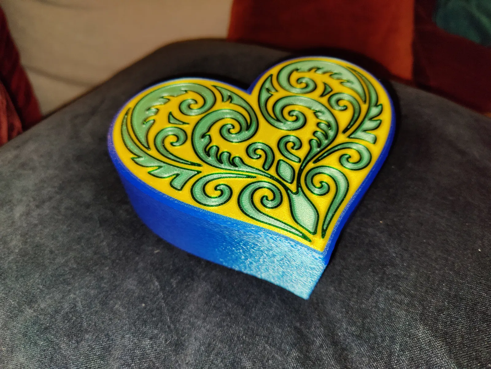 Hộp trái tim với nắp hoa văn Koru đối xứng, đúng chuẩn quà Valentine. Có 2 lựa chọn nắp: 4 màu (MMU/AMS) hoặc 1 màu; phần hộp in 1 màu. Khuyến nghị PLA, nozzle 0.4 mm, textured steel sheet.