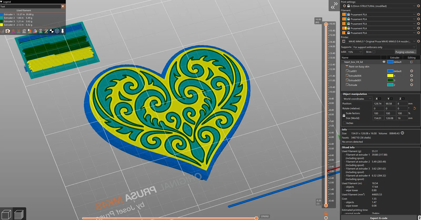 File dự án PrusaSlicer trong mục files được thiết lập cho MK4 với MMU3. Bạn chỉ cần gán màu tương ứng trong slicer. Tất nhiên, file project này cũng có thể dùng cho các cấu hình và slicer khác (ví dụ Orca Slicer). Mình có thêm fuzzy skin cho các vách ngoài (painted).