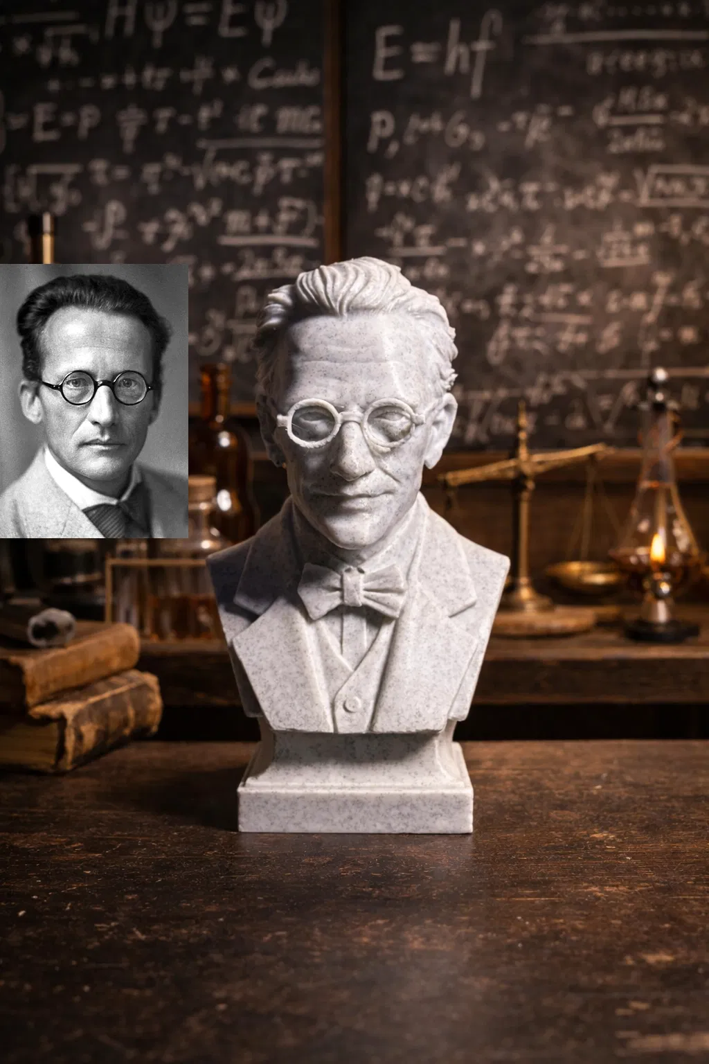 Bức tượng bán thân này khắc họa Erwin Rudolf Josef Alexander Schrödinger, nhà vật lý lý thuyết người Áo và là một trong những nhân vật quan trọng bậc nhất của vật lý thế kỷ XX. Tác phẩm được lấy cảm hứng từ bức ảnh phổ biến và mang tính biểu tượng nhất của ông—hình ảnh đã in sâu trong ký ức công chúng với gương mặt nghiêm nghị, trầm tư, như một biểu trưng cho tư duy sâu sắc và đổi mới.