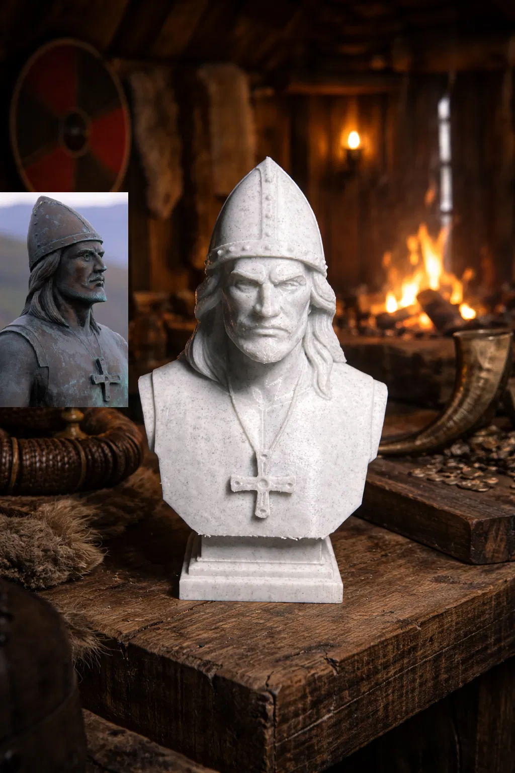 Tượng bán thân in 3D này mang đến một diễn giải điêu khắc bám sát nhân vật lịch sử, nhấn vào các đường nét gương mặt mạnh mẽ cùng biểu cảm điềm tĩnh, tiết chế—tượng trưng cho lòng can đảm, sức bền bỉ và tinh thần phiêu lưu. Cách thể hiện mang phong cách cổ điển nhằm tri ân di sản Viking của Leif Erikson, đồng thời làm nổi bật vai trò quan trọng của ông trong lịch sử những cuộc đại khám phá.