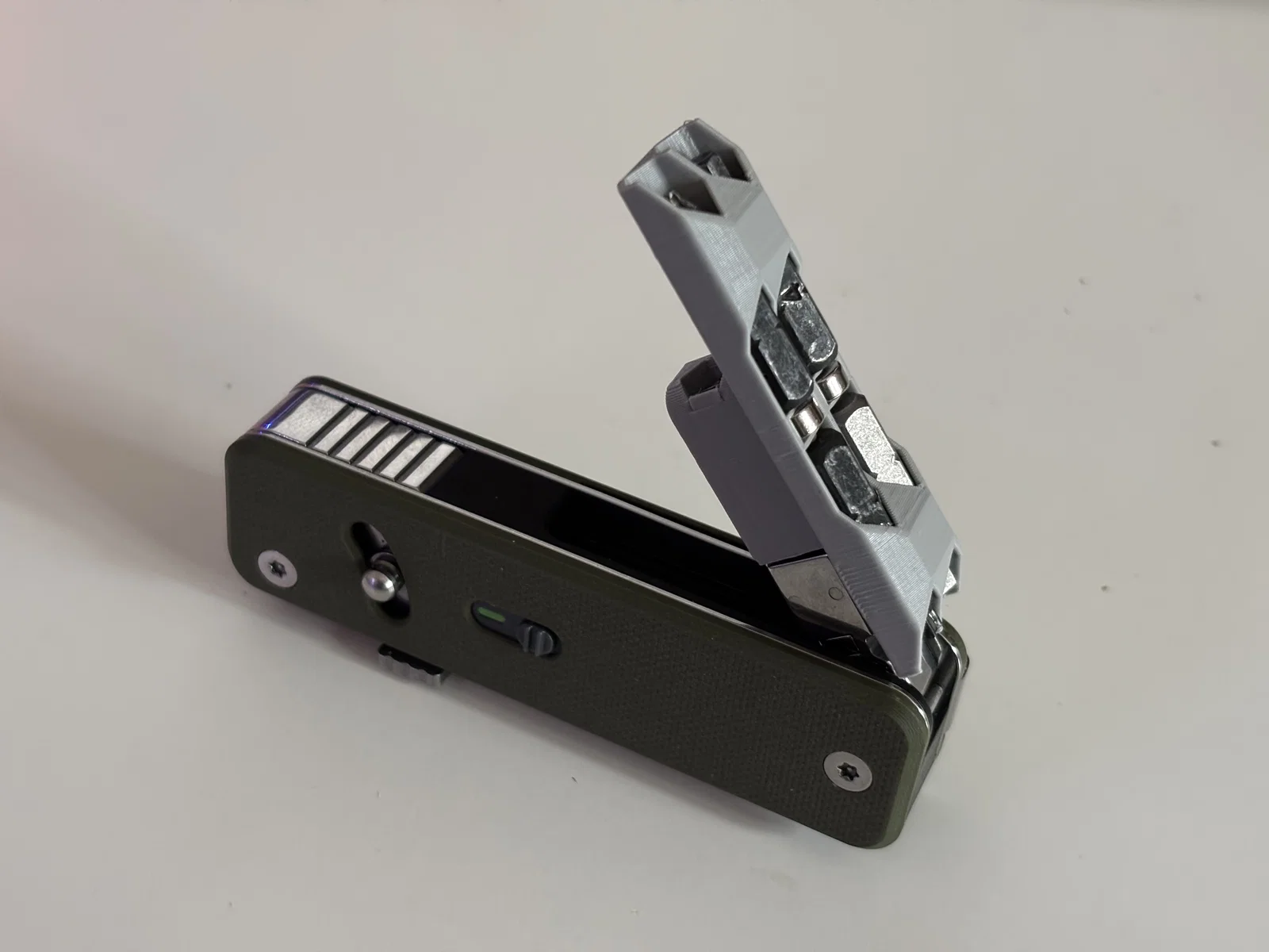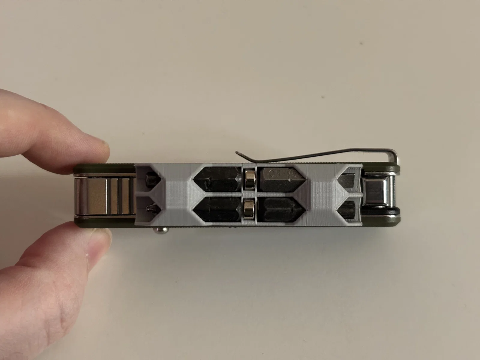 Thiết kế dùng nam châm tròn tiêu chuẩn 6x3mm (cần 2 viên). Nam châm bấm vô khít, hơi cần chút lực, và nhờ đó giữ bits tại chỗ. (Không phải kiểu siêu chắc, nhưng đủ để bits không rơi ra trong túi quần. Có thể sẽ không đủ nếu bạn quăng vô toolbag, hoặc để lăn lóc kêu lạch cạch trong glovebox.)