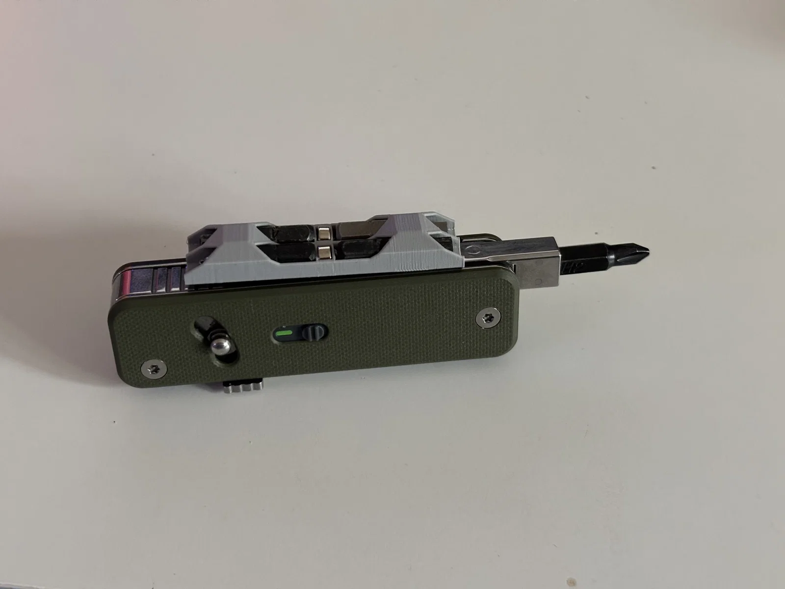 Đây là một holder / holster để mang theo 4 mũi vặn (bits) chuẩn 1/4" dự phòng cho Roxon Flex Companion. Nó được giữ cố định nhờ chính mũi bit đang gắn trong ngàm giữ bit tích hợp, và sẽ trượt ra dễ dàng khi bạn bẻ (pivot) ngàm giữ bit ra để dùng. Nó cũng có thể gắn lại đúng vị trí đó ngay cả khi ngàm giữ bit đang mở, được giữ bằng lực ma sát tì vào liner lock, nên lúc đang dùng ngàm giữ bit bạn không cần phải đặt rời ra hay bỏ vô túi, v.v.