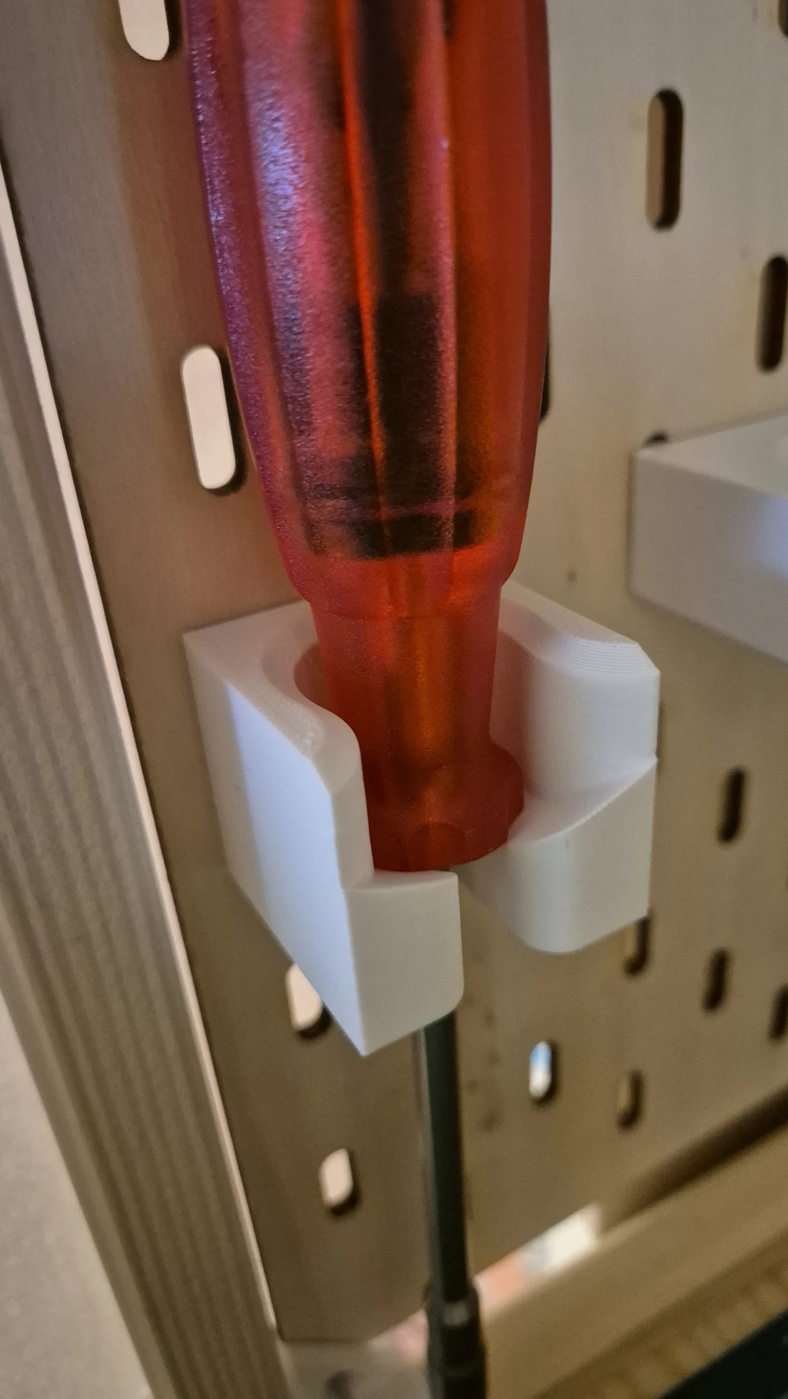 Giá treo tua vít phong cách tối giản, thiết kế dành cho hệ IKEA SKÅDIS. Giá được làm hơi nghiêng để tăng độ bám, độ ổn định và thao tác sử dụng dễ hơn. Cho phép treo/lấy tua vít nhanh chóng mà vẫn giữ chắc tại chỗ.