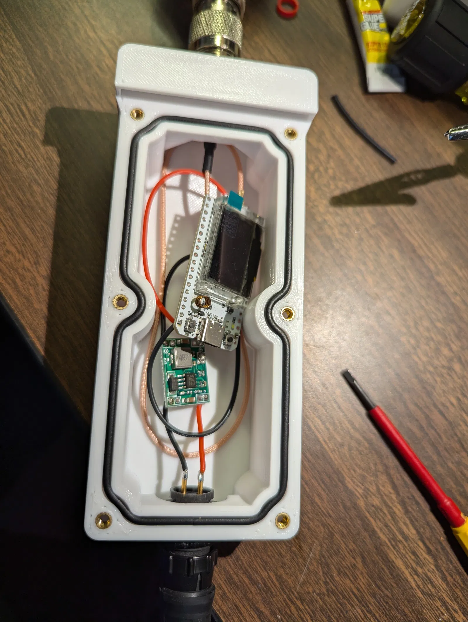 Đây là một cái enclosure dành cho mesh radio, có kèm gasket chống nước, N-connector dạng bulkhead và đầu nối DC chống nước. Radio này dự tính sẽ được cấp nguồn 12VDC từ pin đặt ở chân cột, hoặc đặt trong nhà. Bạn có thể sạc pin bằng bộ sạc AC hoặc tấm solar. Mình dùng một bộ DC-DC converter để hạ xuống 5V cấp cho radio.