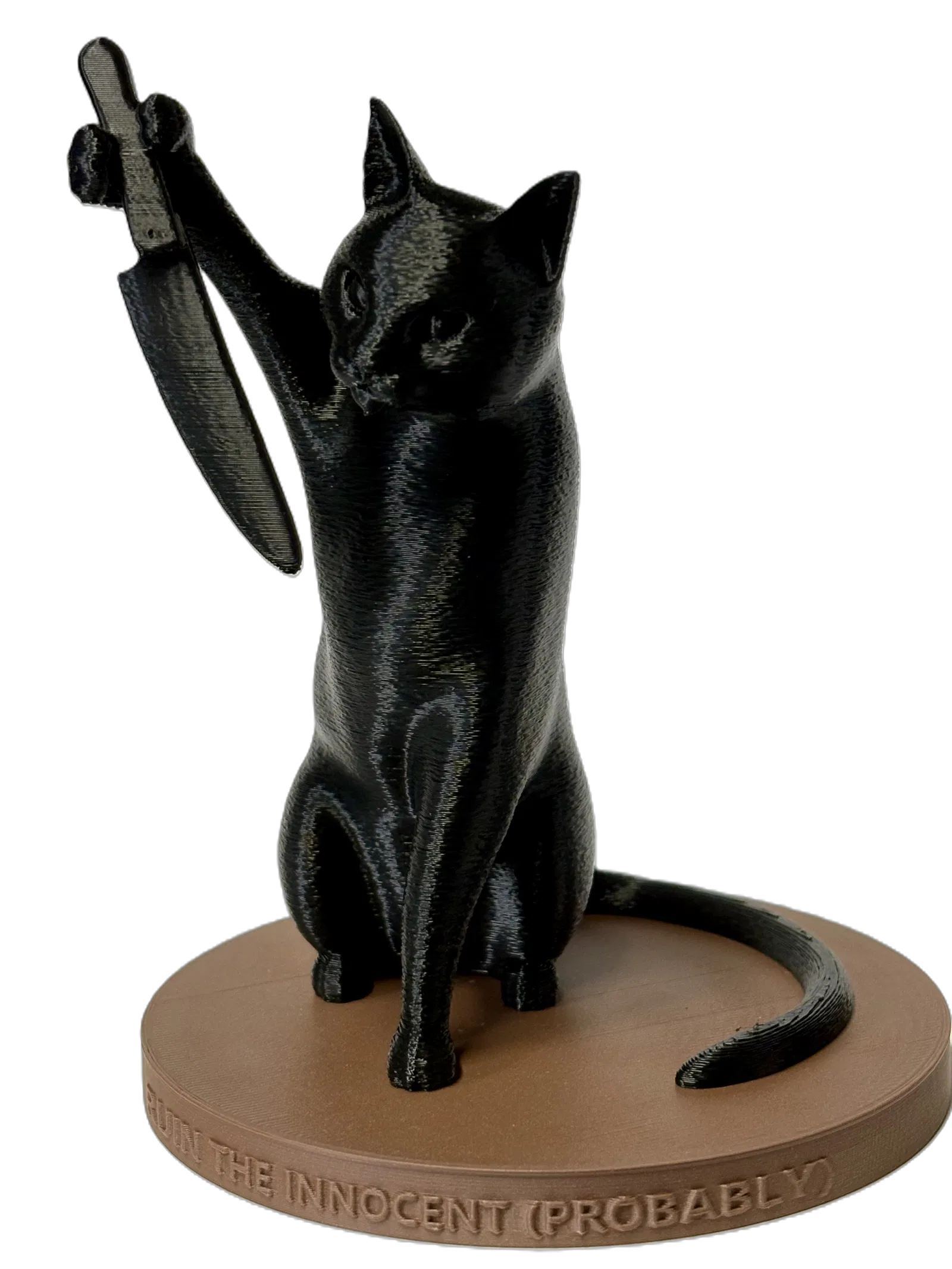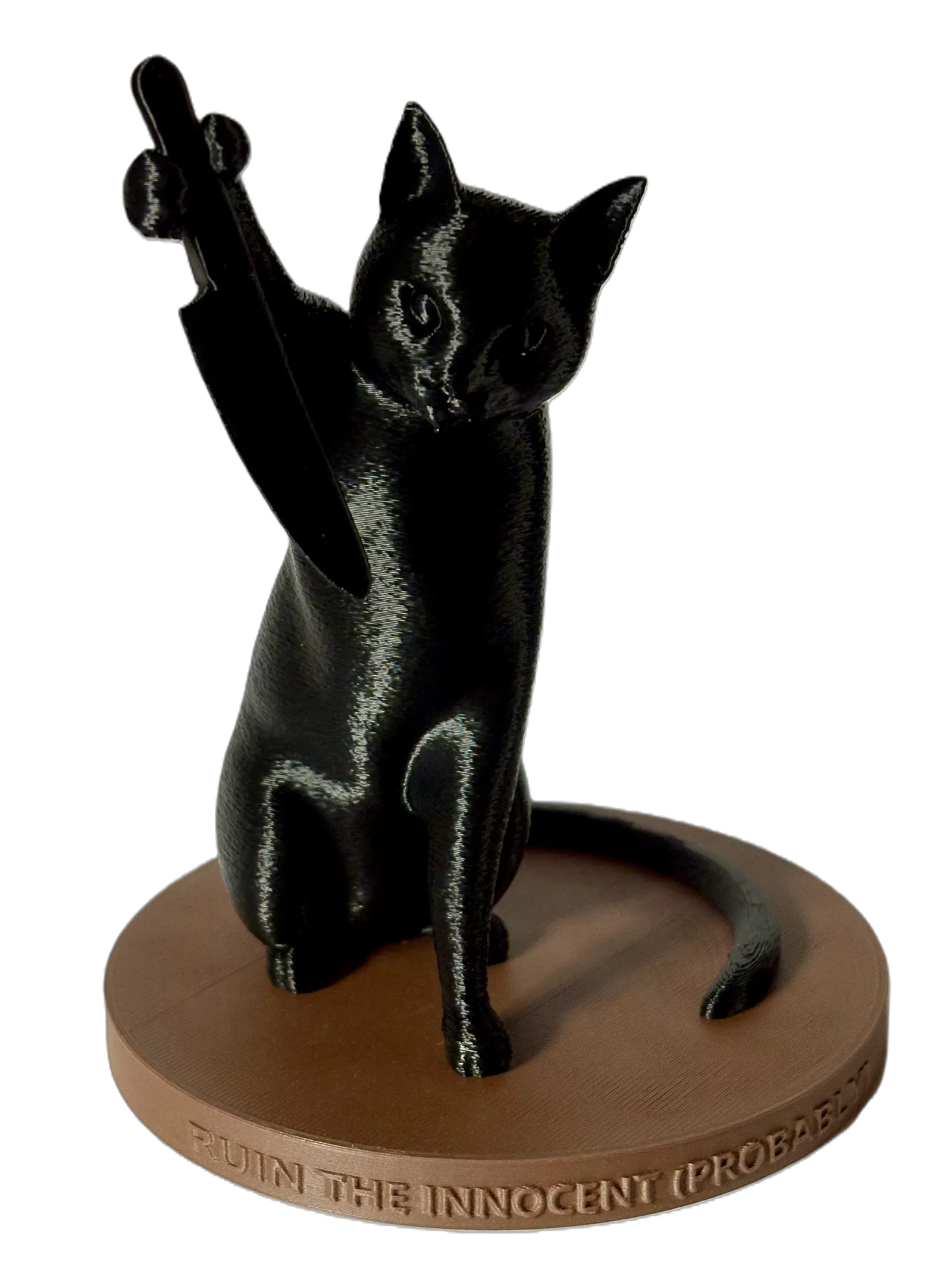 Figurine mèo hài hước tên Ruin cầm dao, mặt ngơ ngác vô tội mà vẫn “hơi nguy hiểm”. Hợp để bàn làm việc/kệ trưng, đem lại đúng kiểu hỗn loạn vui nhộn. Có ghi chú in (supports, PLA/PETG).