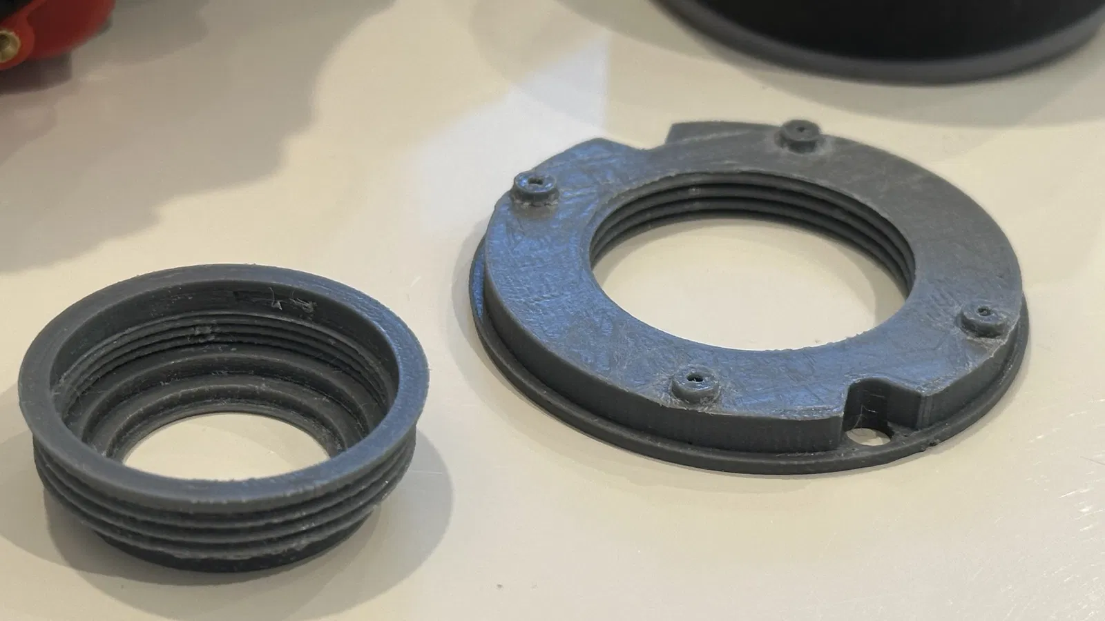 Cụm lắp 3 mảnh dạng modular: Thân được tách thành ba phần riêng, tối ưu cho in 3D. Nhờ vậy ren sạch hơn, ít cần support, và đảm bảo độ cứng vững.