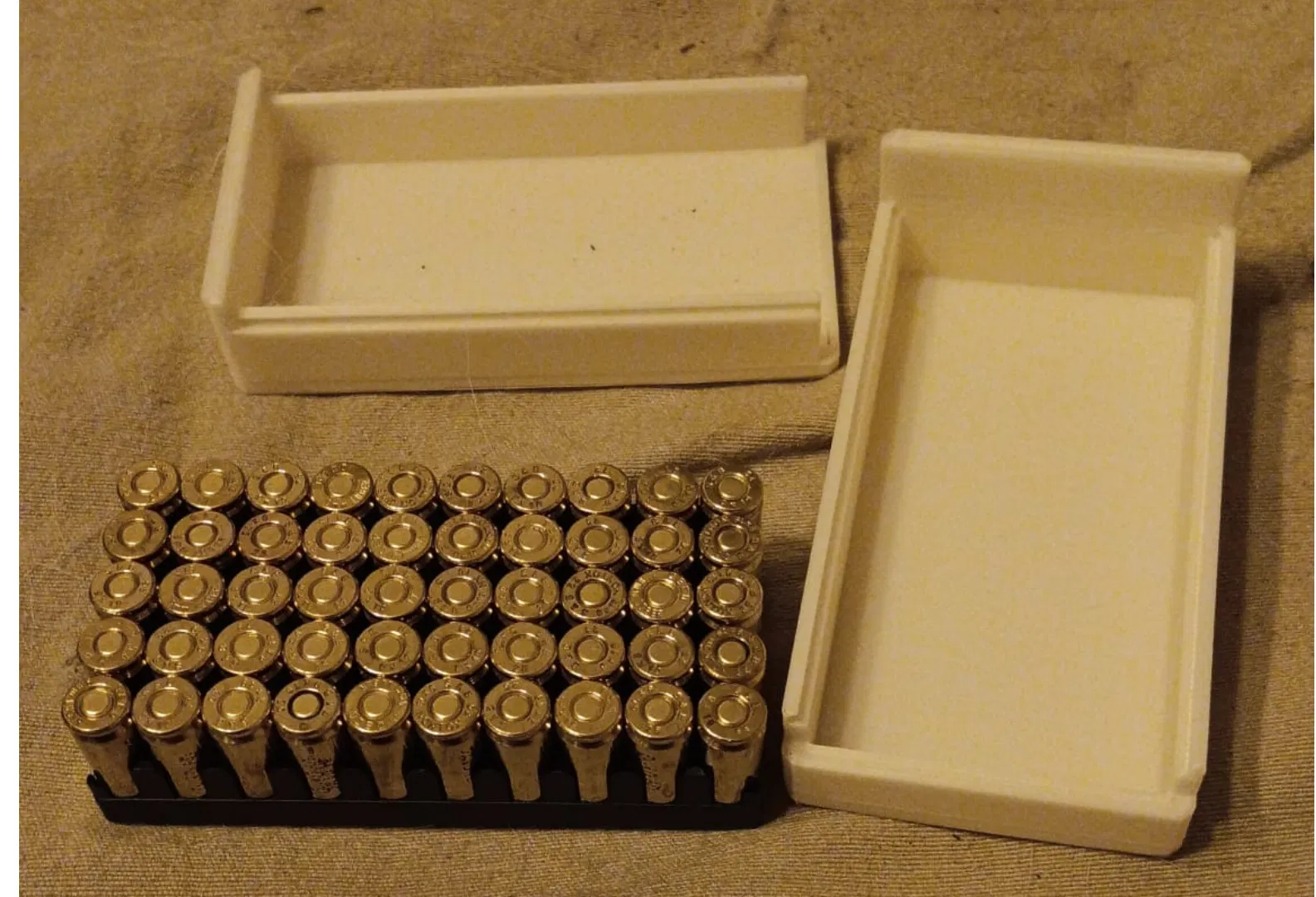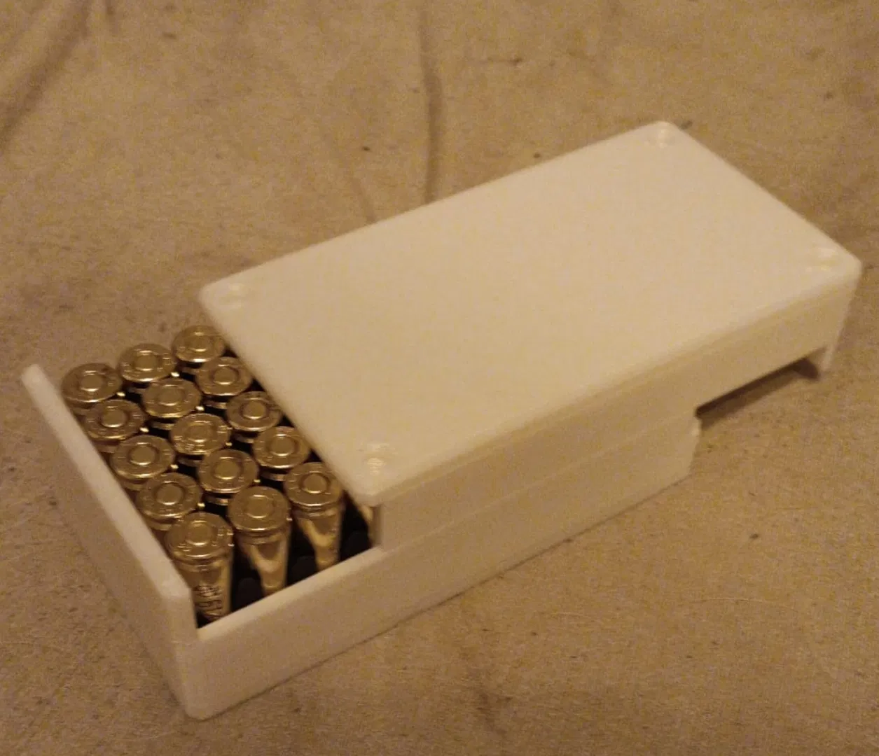 Hộp (ammo) kích thước 100x50x30 mm với nắp trượt, ví dụ để đựng đạn Luger 9mm.