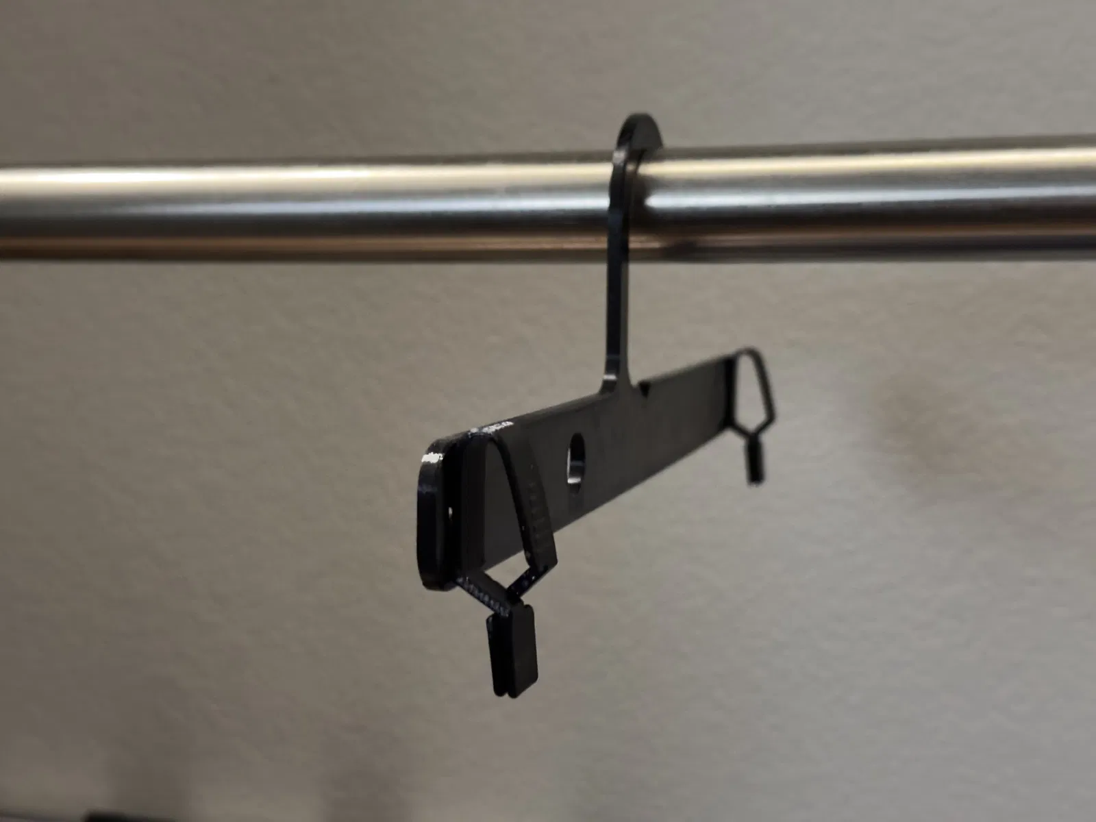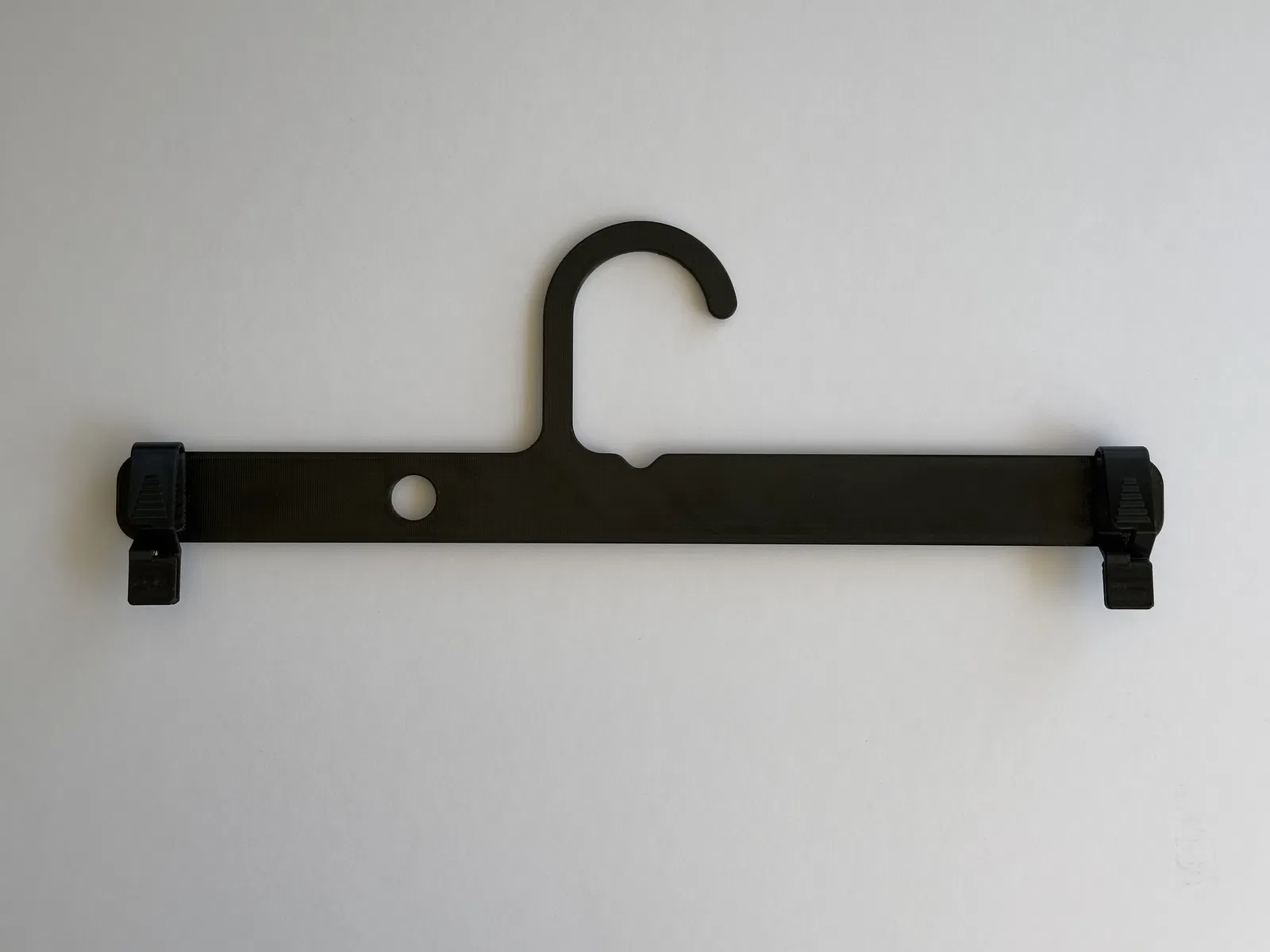 Móc treo quần/váy in 3D hoàn toàn, dùng ngàm kẹp dạng lò xo và móc treo kiểu Ikea SPRUTTIG. Không dùng lò xo kim loại, ít vướng móc bên cạnh, ngàm kẹp có thể thay rời và có bản kẹp mạnh hơn cho đồ nặng.