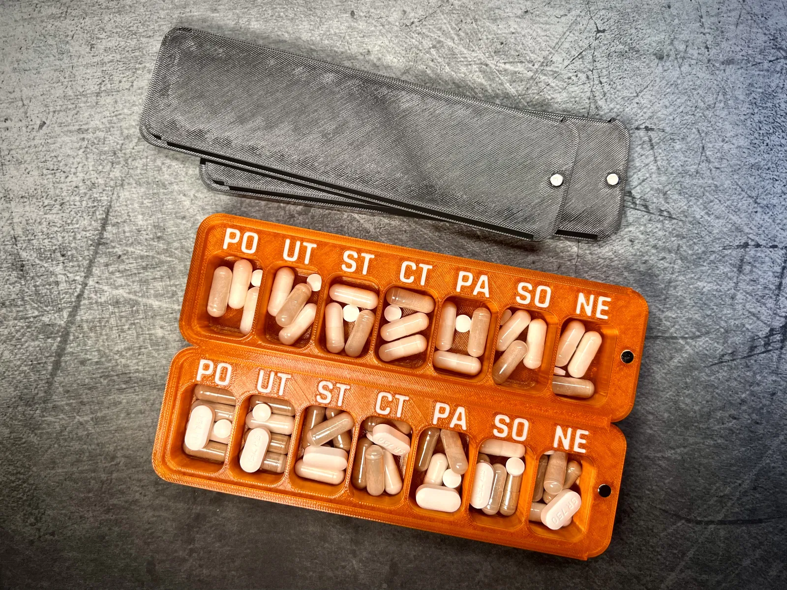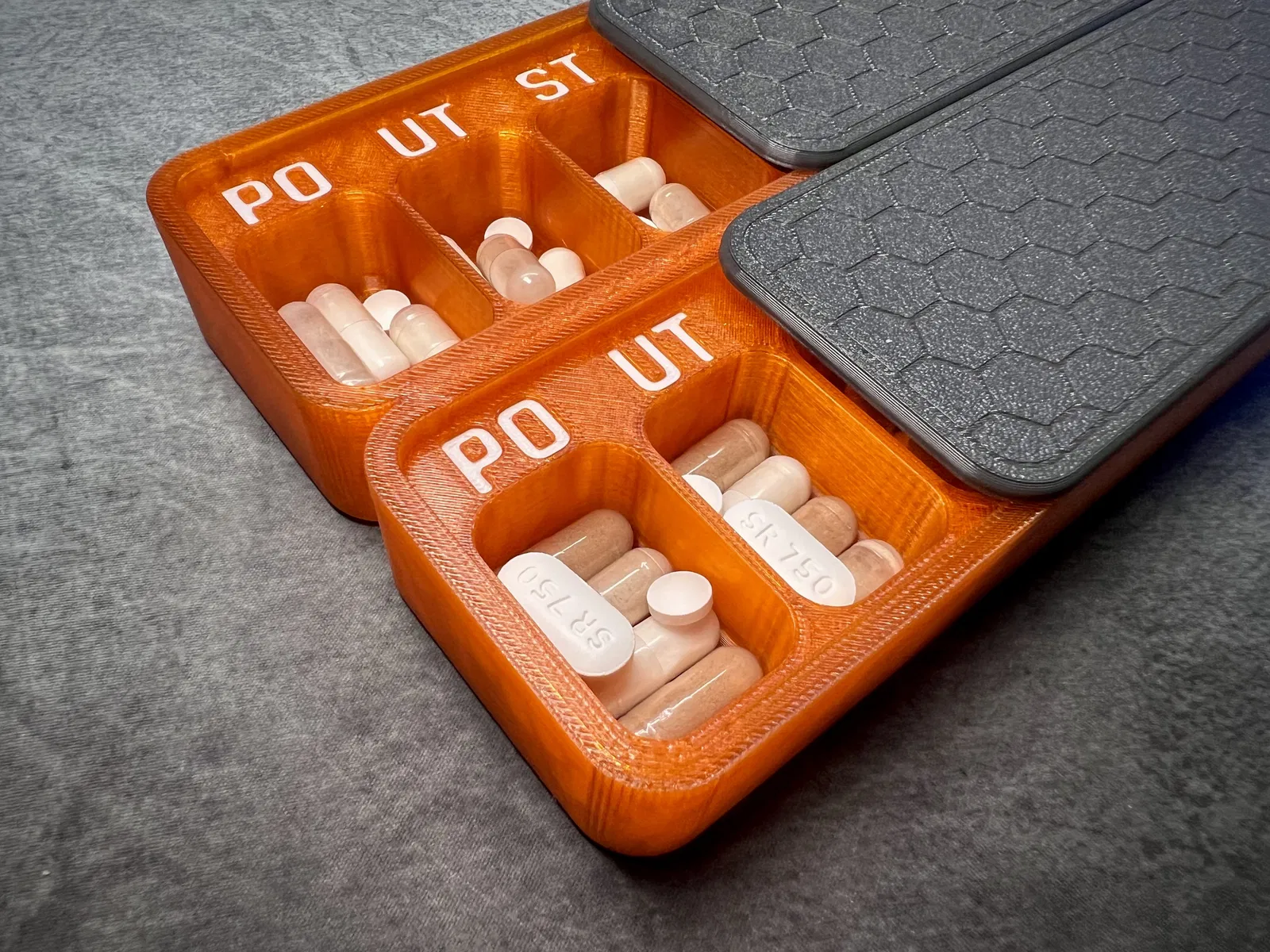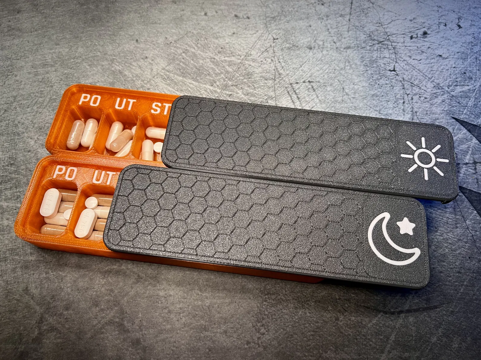 Hộp chia thuốc theo tuần tiện dụng, có nhãn thứ trong tuần bằng tiếng Séc và tách riêng hàng Day/Night giúp theo dõi lịch uống nhanh, đỡ rối. Nhãn & pictogram là object riêng, dễ đổi màu/vật liệu.