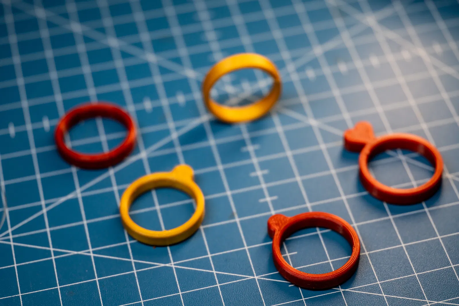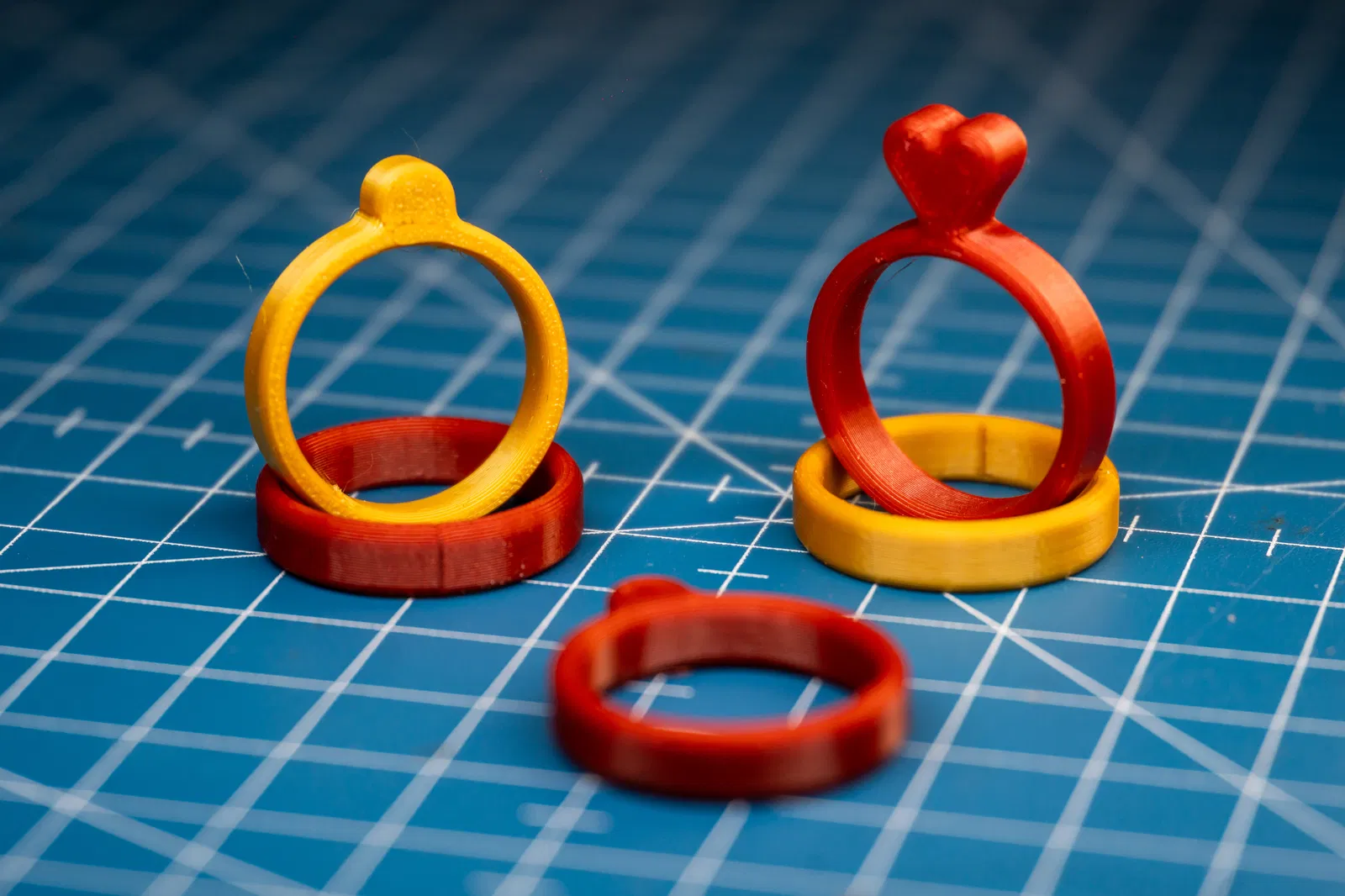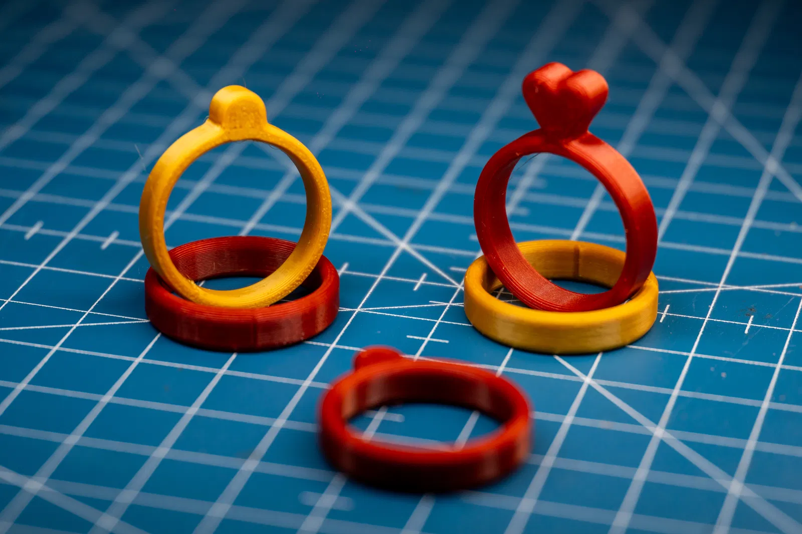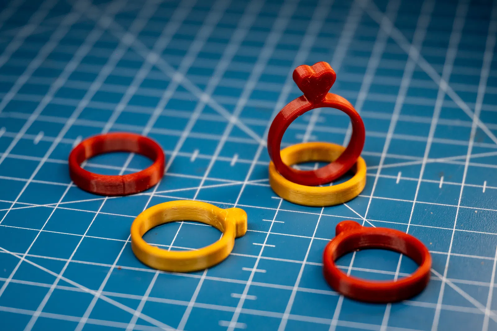 Bộ 3 mẫu nhẫn đơn giản: nhẫn trơn, nhẫn có trái tim và nhẫn gắn viên đá tròn. Mỗi mẫu chỉ tốn khoảng 1g filament, in tầm 5 phút. Mặc định size 9 (18mm), có thể scale trong slicer.