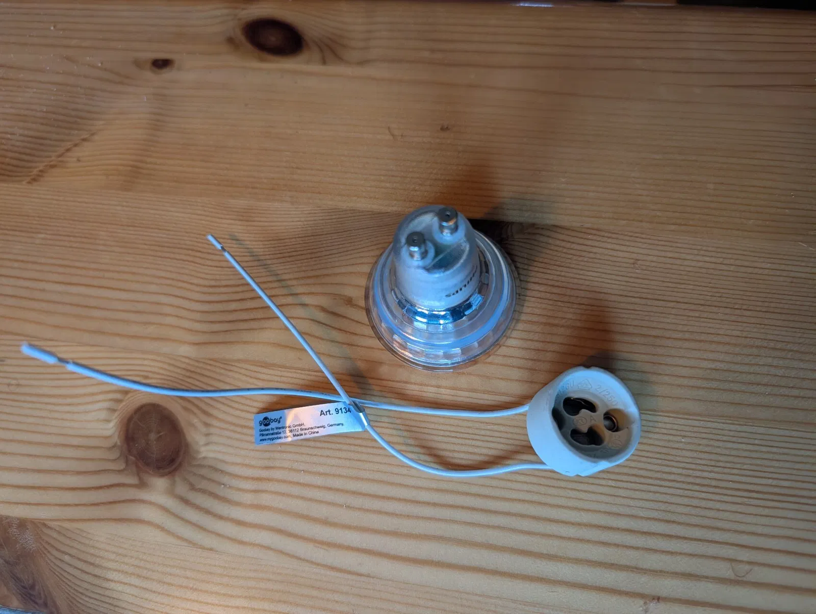 Cần một GU10 socket và hai thanh ren inox M4 dài khoảng 15cm, kèm hai ê-cu M4.