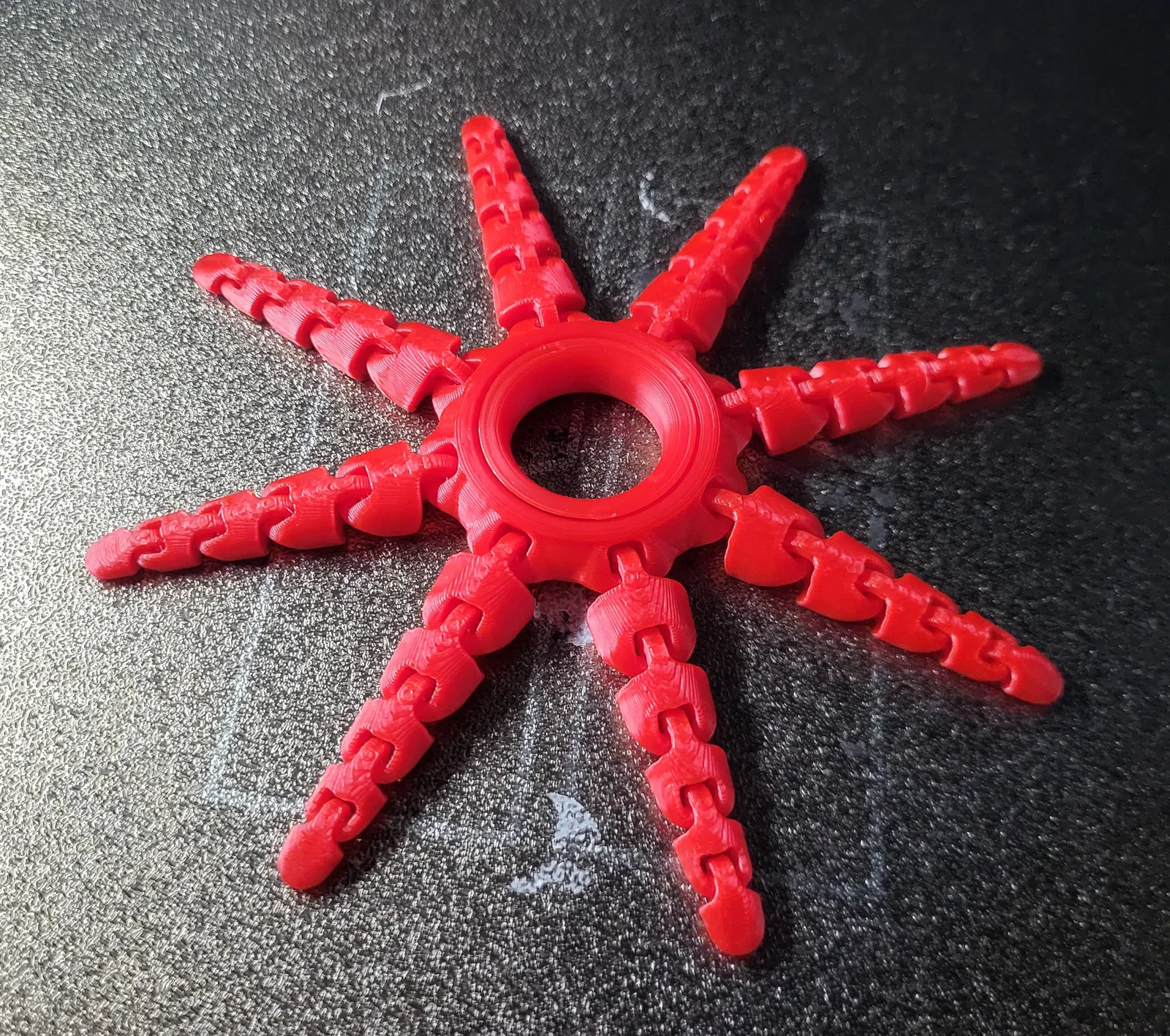 Nhẫn bạch tuộc dạng articulated với 8 xúc tu dẻo linh hoạt và phần vòng trung tâm trơn mịn. Mỗi “tay” chuyển động độc lập, tạo cảm giác nghịch đã tay và dáng organic nhìn rất bắt mắt. Thiết kế in 3D một mảnh, cầm xoay nghịch vui, hợp làm đồ chơi để bàn, fidget đeo tay, hoặc quà tặng độc lạ.