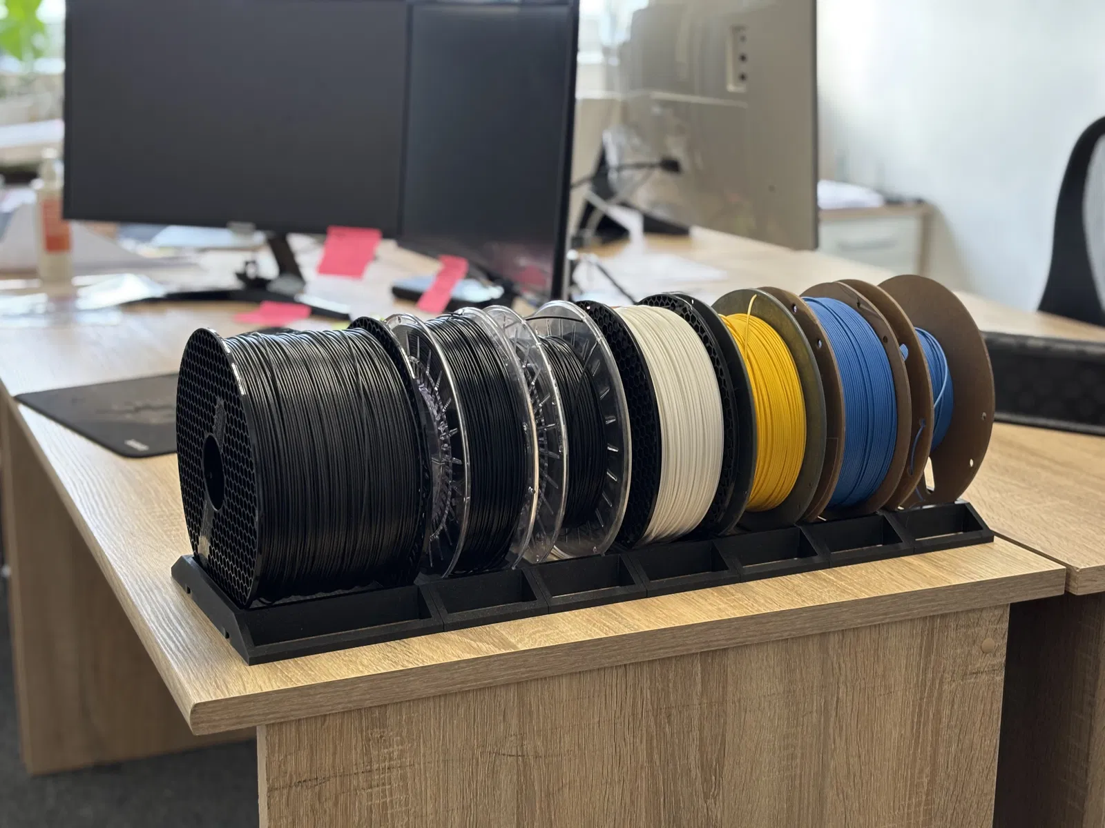 Kệ đỡ filament dạng nối cho cuộn 1kg và 2kg. Các chi tiết có thể bấm khớp (snap) để lắp nhanh, xếp chồng linh hoạt, giúp sắp xếp cuộn filament gọn gàng, ngăn nắp trên bàn hoặc kệ.