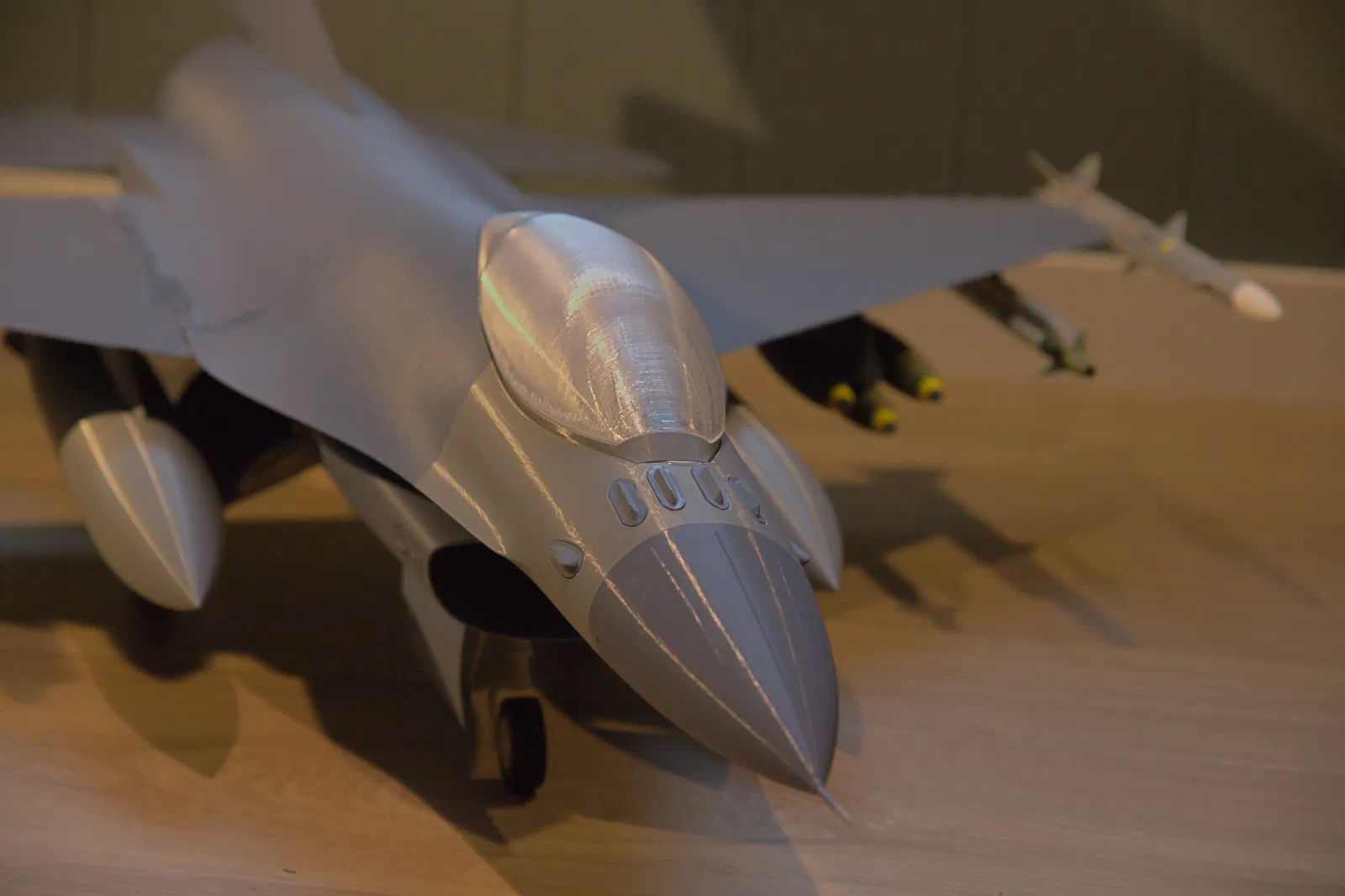 Đây là mẫu F-16 Fighting Falcon tỉ lệ 1/16, có kèm vũ khí, thiết kế để in 3D. Mẫu được tách thành nhiều phần để dễ in và dán lại với nhau. Tất cả chi tiết đều vừa build plate của MK4, và đa số có thể in không cần supports.