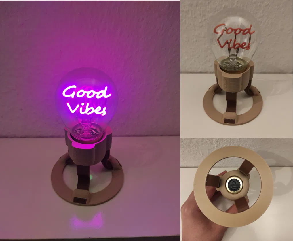 Chân đế đơn giản cho bóng đèn trang trí Legami chuẩn E40, có ren để vặn bóng vào và có lỗ bên dưới để bật/tắt cũng như sạc. File STL gồm 4 phần riêng, cần tách object trước khi slicing.